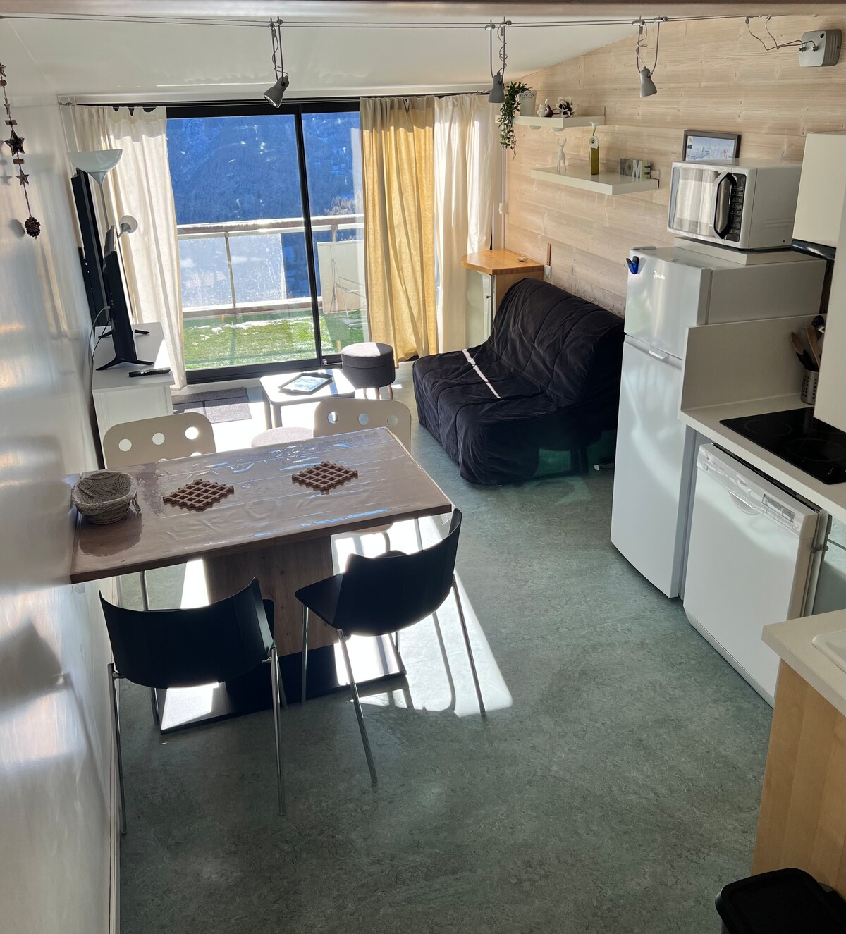 Estudio muy soleado grd balcón con impresionantes vistas a las montañas cerca de todos los servicios a 300 metros (remontes, piscina, bolera, pista de patinaje sobre hielo, restaurantes, cine, bares y salidas de senderismo) Cocina totalmente equipada, tv, baño y aseo separados, zona de montaña para 2 personas, un sofá cama convertible para 2 personas. Aparcamiento privado y taquilla para esquís. Se proporciona ropa de cama, excepto toallas de baño. No se admiten mascotas.