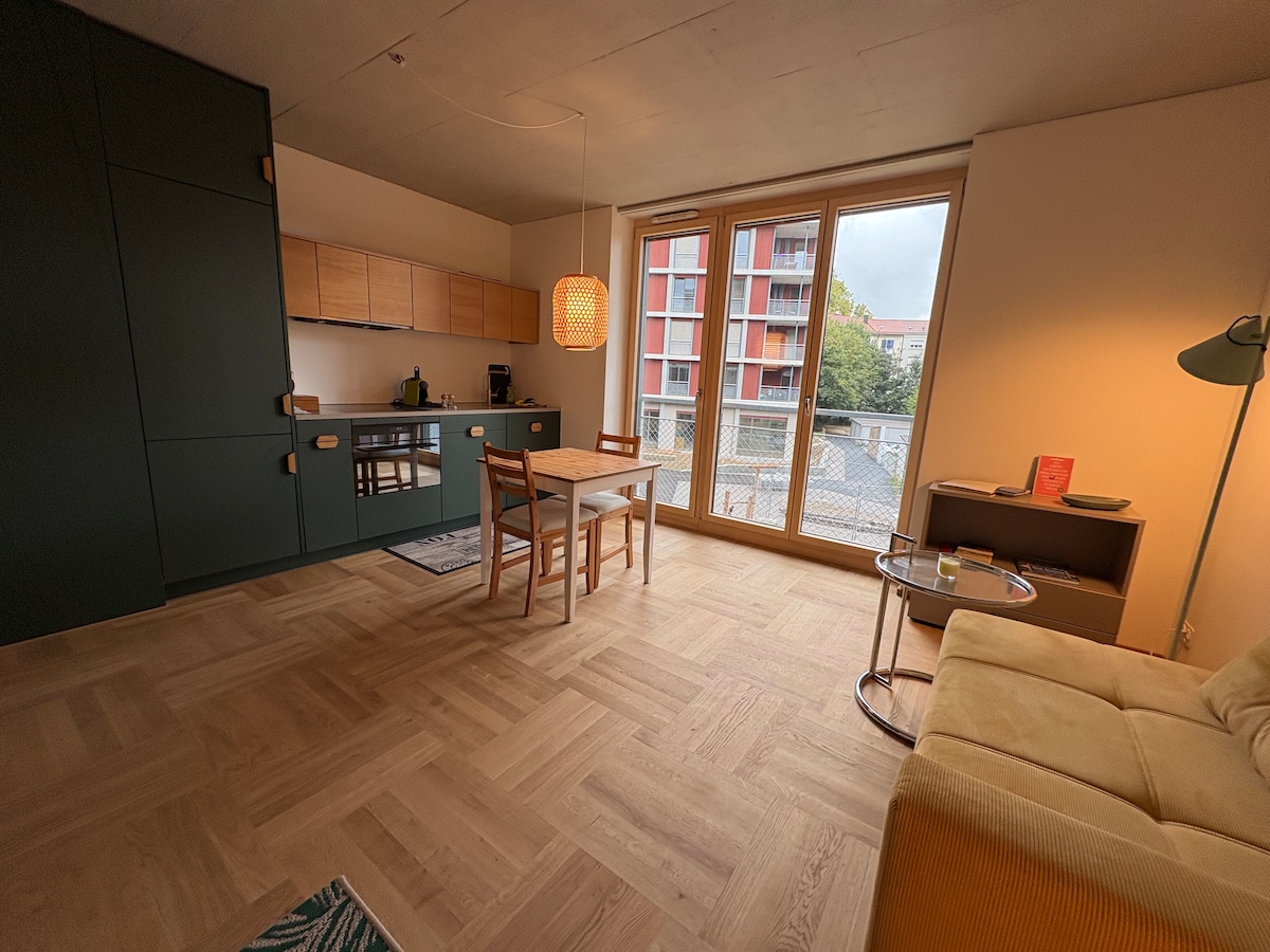 Estudio de ensueño: recuéstate y relájate en este alojamiento tranquilo y elegante. ¡Perfecto para los amantes de la naturaleza! Descubre la tranquilidad de este elegante y moderno estudio de nueva construcción que no deja nada que desear. Totalmente equipado y amueblado con muebles de alta calidad, este estudio no solo ofrece comodidad, sino también una ubicación idílica que hará las delicias de los amantes de la naturaleza. Disfruta de tranquilos paseos por el campo y, al mismo tiempo, de la proximidad a todas las comodidades de la vida urbana.