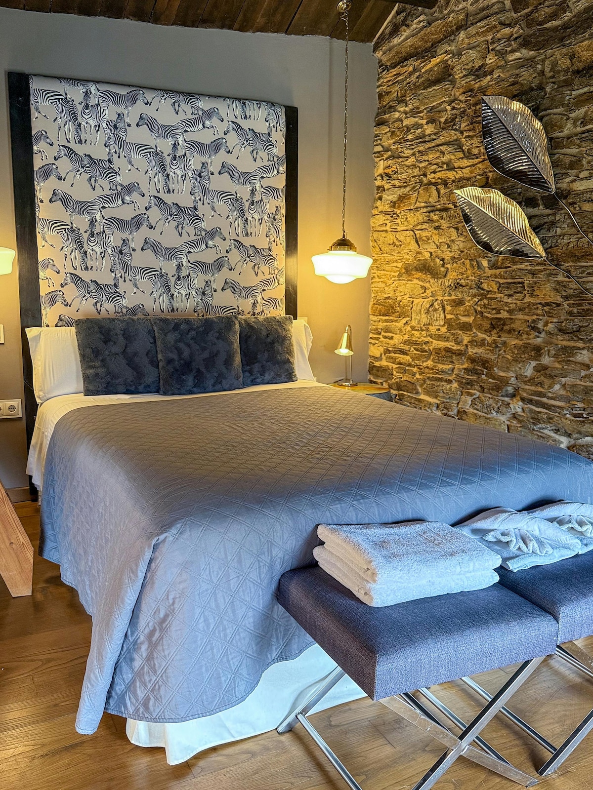 El Cabozo is a charming upper-floor suite for up to 3 guests (2 adults + 1 child). It features a spacious dressing room, cozy attic-style sleeping area with king-size bed, and a stylish bathroom with a large window overlooking the valley. The décor blends elegant vintage pieces with original design furniture, while restored wooden ceilings add warmth and character. WiFi and linens included. Pets not allowed.