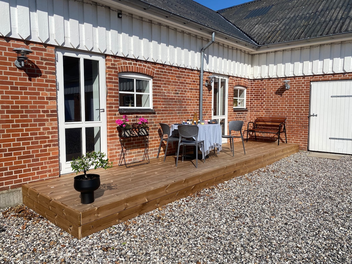 Gæstehuset er 80 m2 og indrettet i en gammel staldbygning, alt er nyrenoveret og lækkert. Der er 2 store værelser med 4 sovepladser. Der kan laves to ekstra opredninger. Hyggeligt opholdsrum med spiseplads og hyggekrog. Dejligt badeværelse i New yorker stil. Køkken med alt du har brug for. Du har egen indgang og parkering. 2 træterasser med sol. Adgang til pool, bordtennis, dart mm. I tilstødende gildesal. Natur udenfor døren, indkøb, stor aktivitets og skaterpark 1,5 km afstand