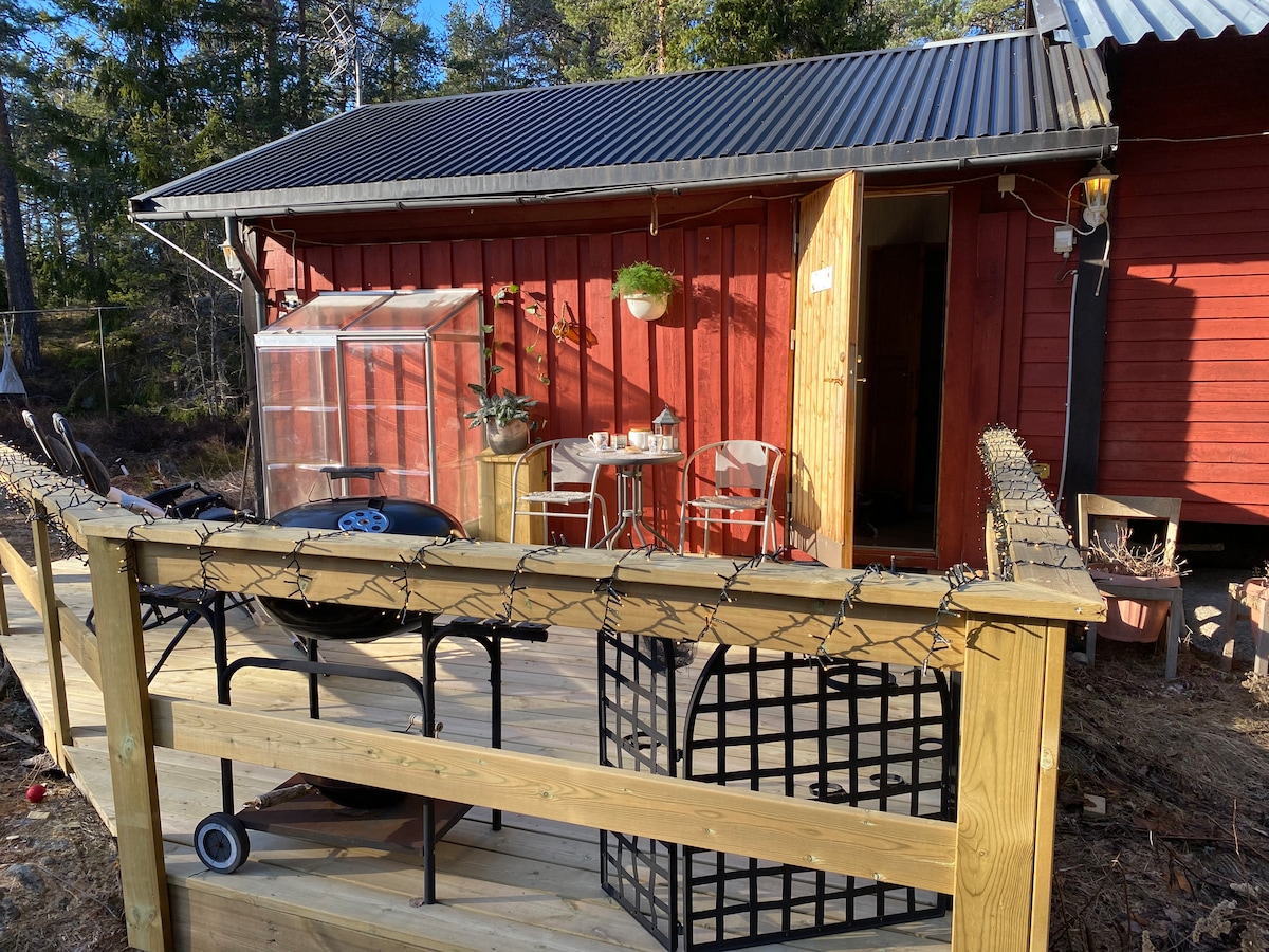 Cabaña independiente en el increíble Täljö, ¡con sauna privada! La casa cuenta con una cocina y una habitación con dos camas individuales. Amplia terraza de madera con sol de la mañana y sol de día. El bosque está a la vuelta de la esquina con bonitos senderos. Hay bicicletas para pedir prestadas para excursiones. ¡Parrilla de carbón disponible para agradables noches de barbacoa! A 5 minutos a pie del tren y a 35 minutos en tren de Estocolmo. (Coste del tren de unos 3,5 euros) TV con cromecast. Wifi gratuito. Está a unos 10-15 minutos a pie del lago de natación más cercano, y en bicicleta está a unos 7 minutos.