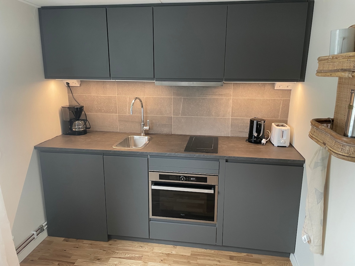 Relájate en esta tranquila y elegante Bellehouse. La proximidad del mar y la natación te dan una buena experiencia. La casa (25 metros cuadrados) tiene un estilo moderno con espacio para cuatro personas, cama para dos en un loft y dos para dormir en un sofá cama. Cocina con nevera , congelador, estufa, estufa. Mesa de comedor con espacio para 4 personas. Inodoro con ducha. La casa está en el continente y es fácilmente accesible.