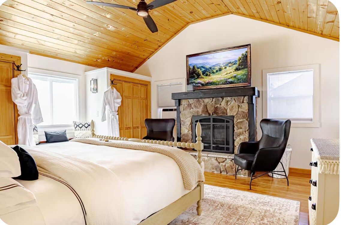 Spacious first floor with inviting fire place, comfy living room, chest with games, and full entertainment system. Open kitchen is great for entertaining for large groups or indulging in the culinary arts. Gigabit wifi and a comfortable space for office work with a desk, working printer, drafting table and easel for creative endeavors. Quiet nights and comfortable bedrooms will give you a great night sleep--you'll need it for kayaking in the morning!