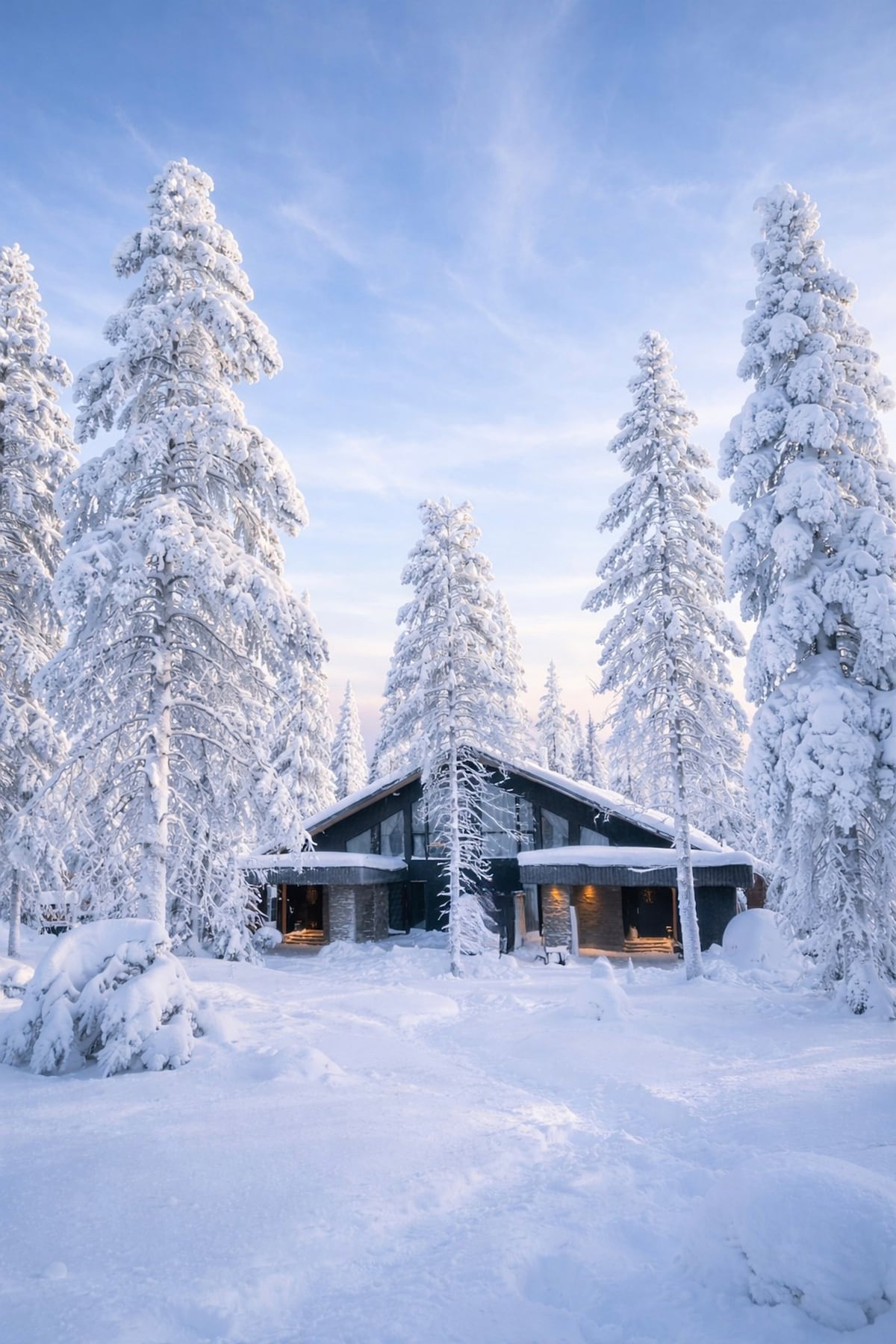 Black Villa is a private design villa nestled in the peaceful nature of Lapland. In the villa’s private spa area, you can relax in the bath while watching the northern lights or enjoy a winter wonderland view from the sauna. The high-quality Scandinavian interior creates a calming ambiance, while the dark walls help ensure a restful night’s sleep. The fully equipped kitchen invites you to cook and enjoy cozy dinners by the fireplace.