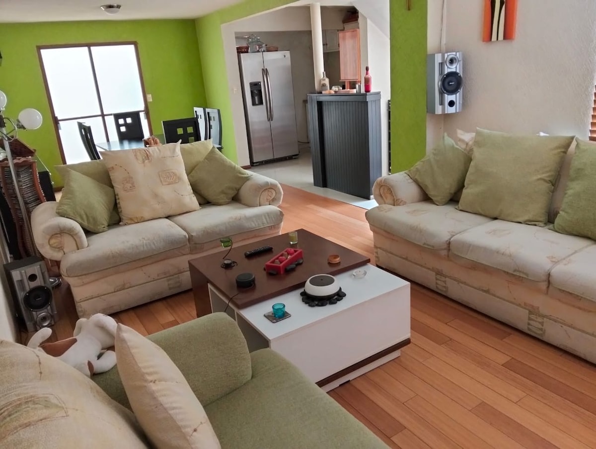 Es una habitación nueva, con estilo moderno-prehispánico. Cuenta con amplios espacios y estacionamiento. Un lugar muy especial ya que tiene muy buena iluminación y un jardín amplio que brinda paz a tu ser. Encontrarás una hamaca donde podrás disfrutar el atardecer o leyendo un buen libro. Hay accesos compartidos como el comedor y cocina. Somos tres miembros en la familia; Amigables y tranquilos.