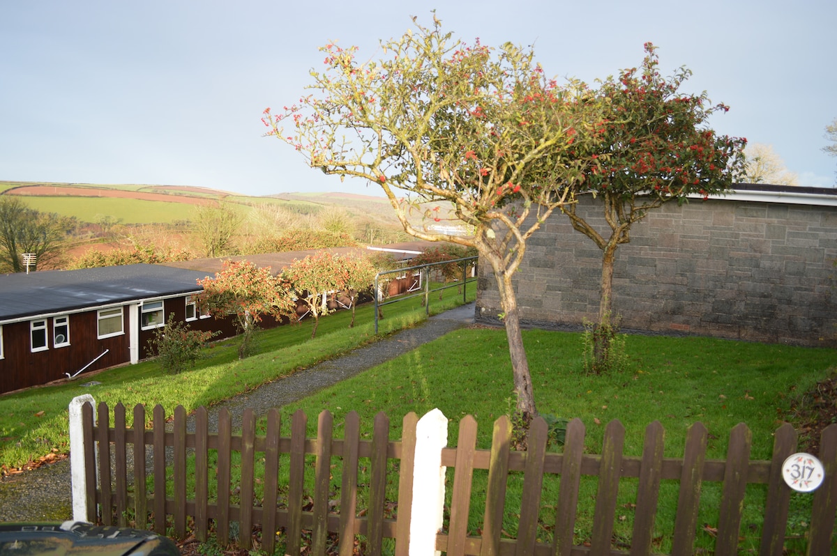 - Chalet bungalow independiente en un tranquilo parque de vacaciones a las afueras de Dartmouth con vistas a la campiña circundante. - Dormitorio doble y con dos camas individuales. - Cocina con mesa de comedor, lavadora, nevera con congelador, microondas y utensilios. - Sala de estar con TV, 2 sofás, puertas de patio a zona de césped con vistas. - Baño con bañera, ducha eléctrica, lavabo, toallero eléctrico, inodoro y calefacción por suelo radiante si es necesario. - Electricidad con contador de monedas de 1 libra. - El césped compartido rodea el chalet, con asientos y mesas en la parte delantera y trasera.