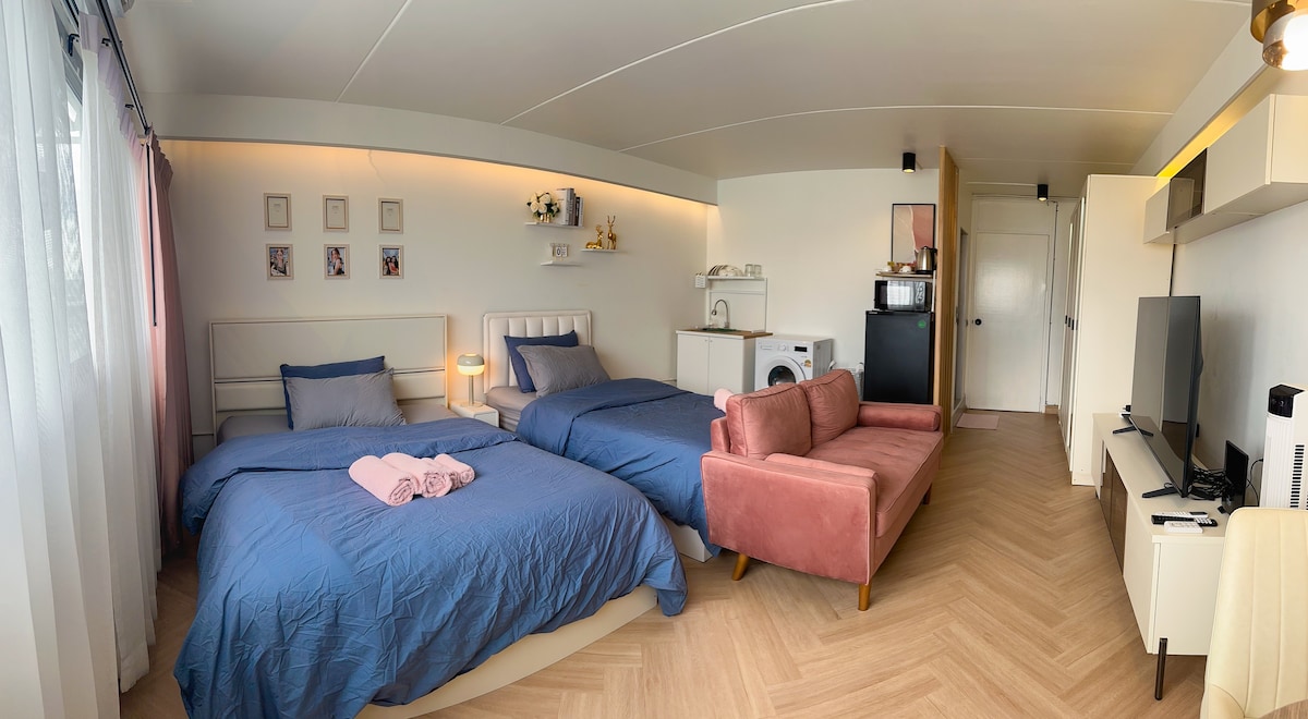 Our cozy studio is located on the 4th floor of a 24-room serviced apartment. It features a king-size bed, private bathroom and balcony, air conditioning, fridge, hair dryer, and stable Wi-Fi. Enjoy weekly maid service and full in-room amenities. Situated just outside downtown Bangkok, our place offers a peaceful, authentic local experience while staying close to restaurants, shops, and convenient public transit.