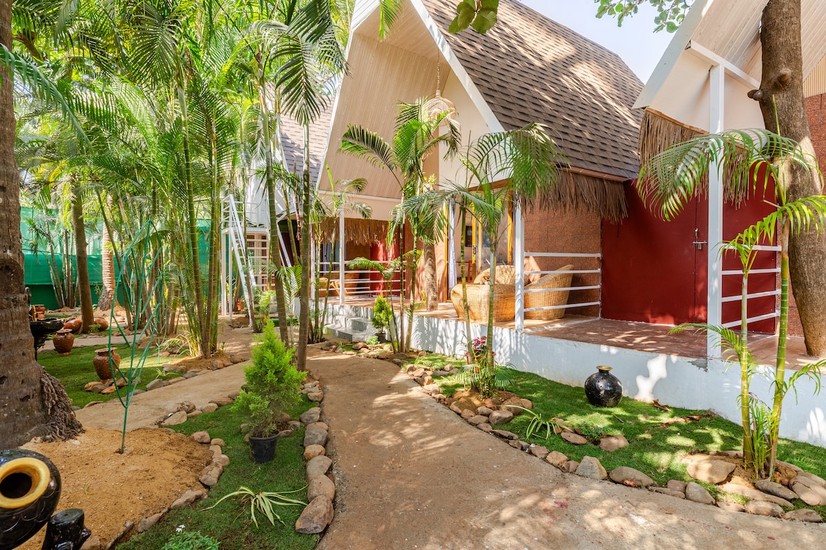 Birds of a Feather presenta el , un acogedor refugio bohemio de 3 dormitorios escondido en un palmeral privado en Agonda, al sur de Goa. Mi esposa y yo lo hemos diseñado cuidadosamente con una iluminación cálida, texturas de madera y detalles verdes para ofrecerte una combinación perfecta de confort y naturaleza. A solo 800 metros de la playa de Agonda, una de las costas más limpias y tranquilas de Goa, es la escapada tropical perfecta para relajarse, recargar energías y sumergirse en el sereno ambiente de Goa. ¡Hecho con mucho amor, solo para ti!