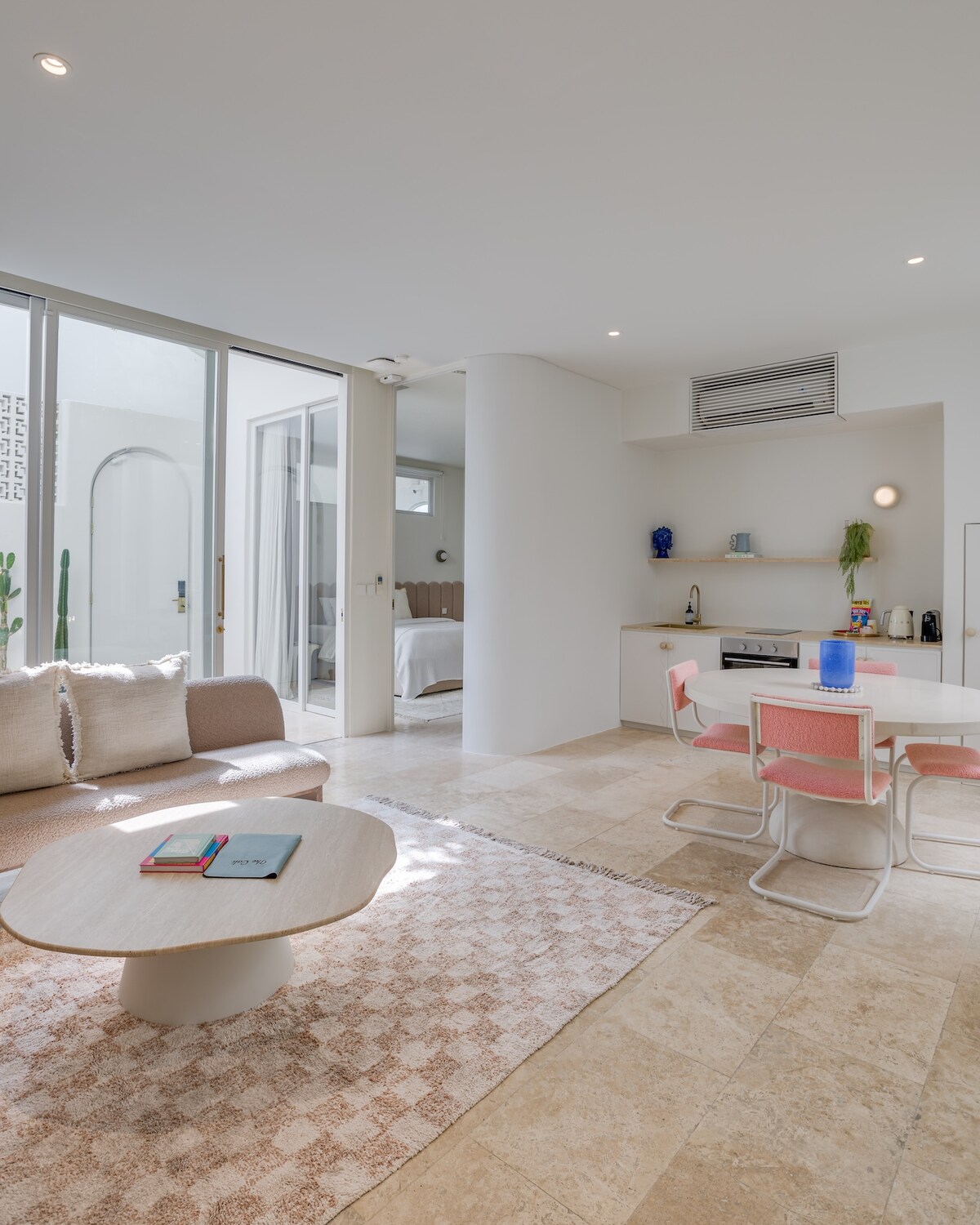 Perched on a cliff overlooking the beach in rural Tabanan, Bali, this unique villa features seven private bedrooms, each in its own building for maximum privacy. All rooms offer air conditioning and en-suite bathrooms with Cycladic-inspired design and modern touches. A central pool, indoor living and dining area with kitchenette, and an outdoor dining space with stunning sea views create a peaceful seaside retreat.