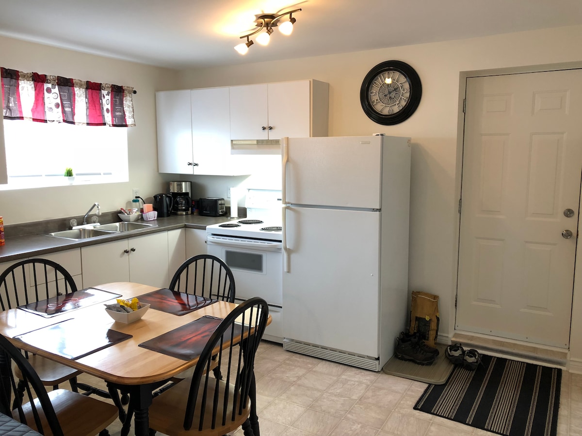 Precioso apartamento en el sótano de un dormitorio. 2 niños pequeños viven arriba y perros, ten en cuenta que al reservar puede ser ruidoso a veces :) 1 cama matrimonial 1 sillón de cuero 1 silla de cuero 1 cuna individual Cargador de E/V para vehículos eléctricos 🚗 6:00 p. m., registro de entrada. A 20 minutos de ambos hospitales y aproximadamente a 20 minutos del aeropuerto. Consulta nuestra política de cancelación estricta antes de reservar. Las reservaciones no son reembolsables ni transferibles. NO se permiten MARISCOS en la unidad debido a alergias. Registro provincial n.º 5468
