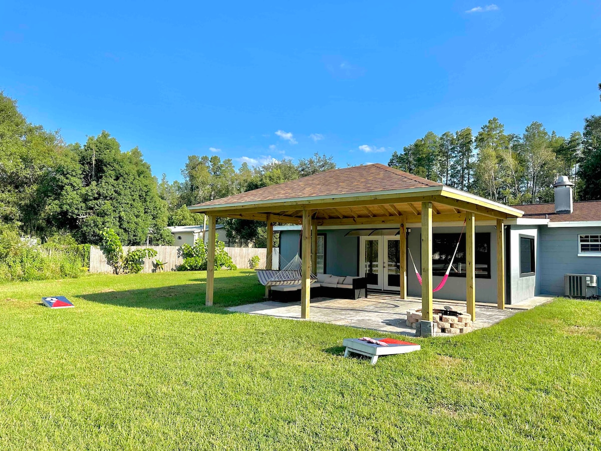 No forma parte de Paradise Lakes. ¡Llega a esta casa recién renovada y no te preocupes por el resto de los días! Disfruta del cielo estrellado por la noche mientras estás sentado alrededor de la chimenea en nuestro acogedor salón al aire libre. Esta espaciosa casa, sentada en un lote de 2 acres, se encuentra lo suficientemente lejos de la bulliciosa ciudad para tener una estancia serena y lo suficientemente cerca para un rápido viaje en coche para ver lo mejor que Tampa tiene para ofrecer. Esperamos poder ofrecerte una estancia excelente