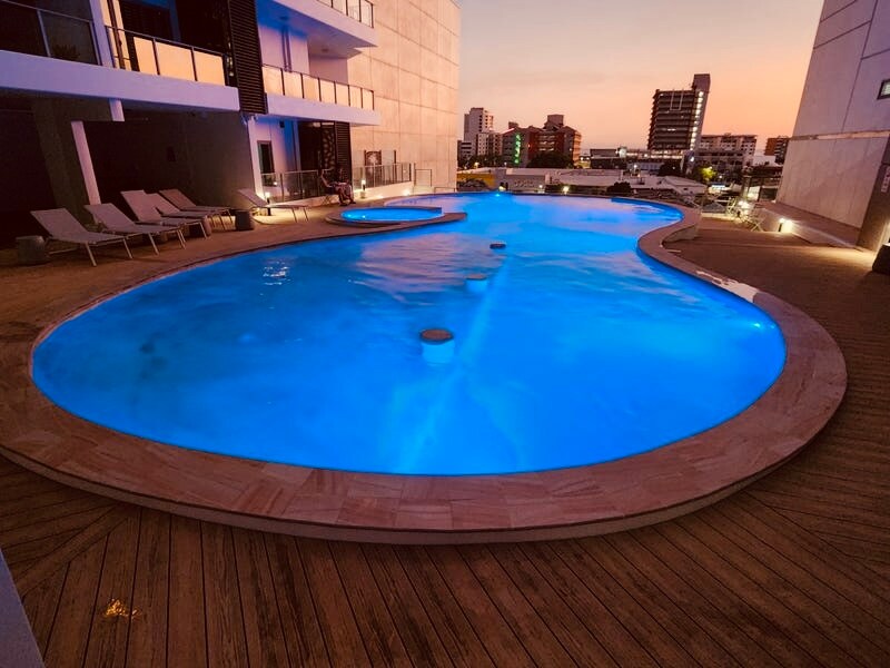 Oasis moderno en rascacielos con piscina y vistas a la ciudad