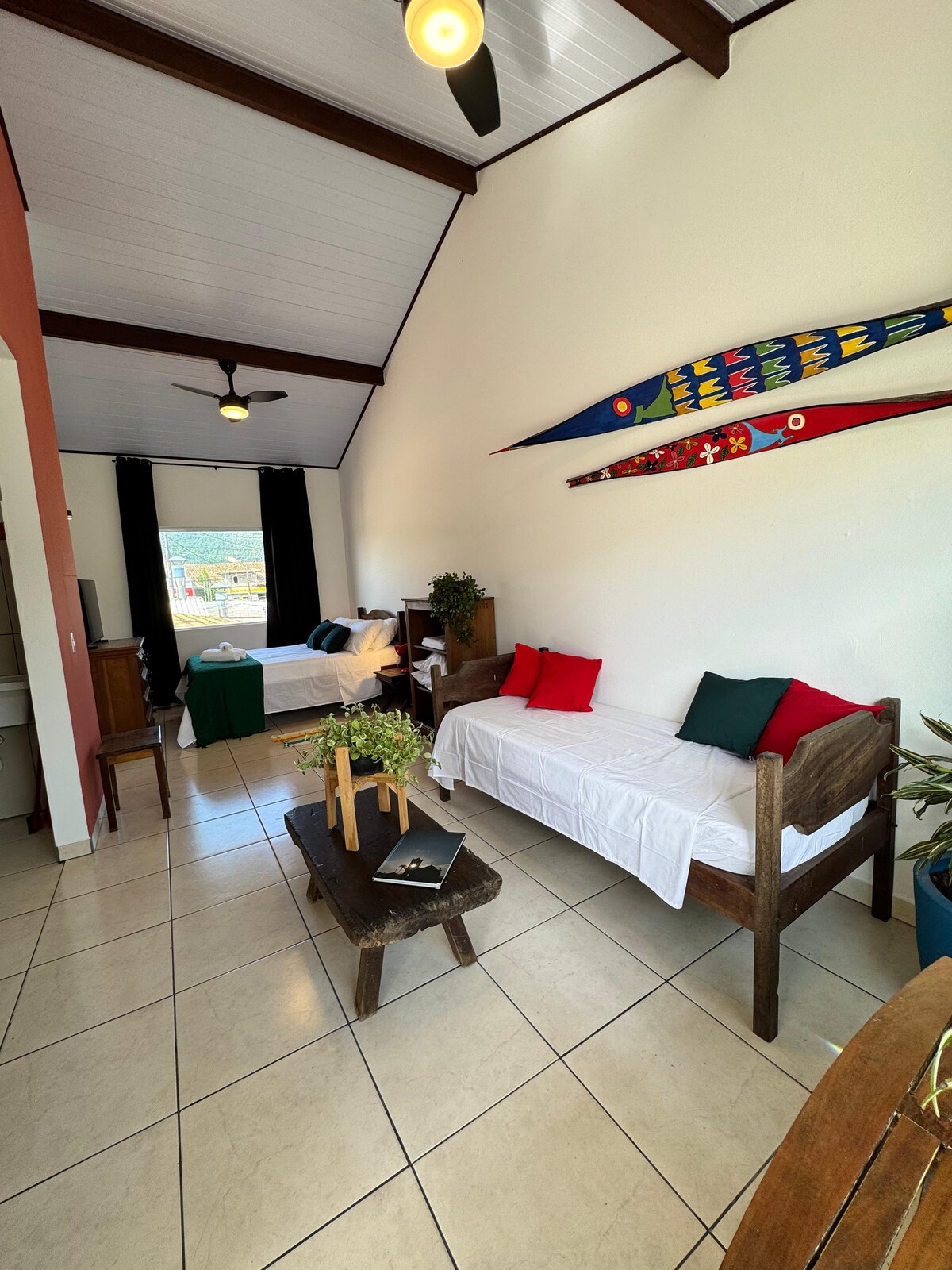 Estamos ubicados a orillas del río Perequê-Açú, en el tranquilo y arbolado barrio de Caborê, a solo 10 minutos del Centro Histórico. La región tiene calles pavimentadas y ciclovías. Ustedes se alojarán en un sofisticado apartamento, diseñado y construido por el reconocido arquitecto de Paraty Zé Cássio. El apartamento dispone de un amplio piso con un dormitorio y una cocina muy espaciosos y bien equipados, un buen baño y un hermoso balcón con mesa de desayuno y tumbonas para contemplar el hermoso paisaje.