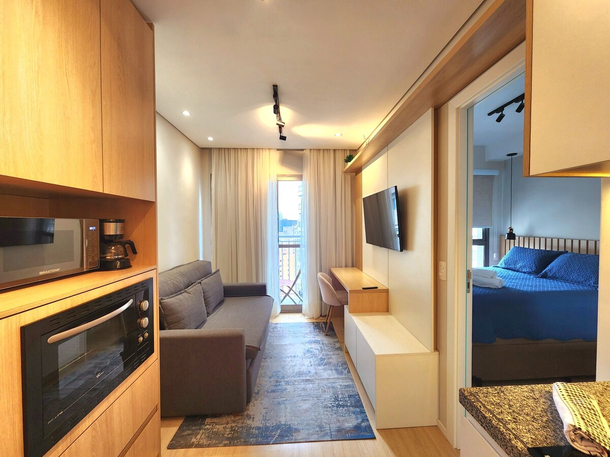 Apartamento completo, con internet, aire acondicionado y ventilador de techo, microondas, heladera, cocina de inducción, ubicado a 950 metros de la estación de metro Campo Belo, en un condominio con piscina al aire libre en la azotea, piscina climatizada, cancha de tenis, gimnasio súper equipado, tienda de conveniencia, sauna y spa, espacio de coworking, lavandería, servicio de limpieza y portería las 24 horas