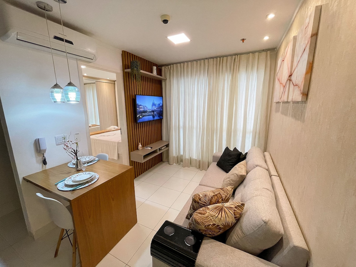¡Apartamento único y acogedor! Con 1 dormitorio, 1 cama queen, totalmente amueblado, excelente ubicación, con Wi-Fi, 2 televisores inteligentes, electrodomésticos como microondas, cafetera, filtro con agua fría, plancha, secador de pelo, ropa de cama y baño y garaje privado. Área de ocio completa con piscina climatizada, sauna, jacuzzi, gimnasio, lavandería, y en el centro comercial hay excelentes restaurantes y cafeterías. Junto al mejor centro comercial de Goiás, Flamboyant Shopping.