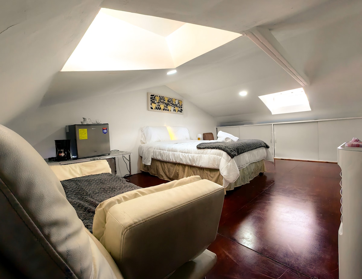 Private apartment with one room, one bathroom, living room, kitchen and laundry area. A hidden gem in the heart of San Jose that welcomes you with a modern and cozy space, plenty of natural light, and an impressive view of the mountains in the southern central valley.