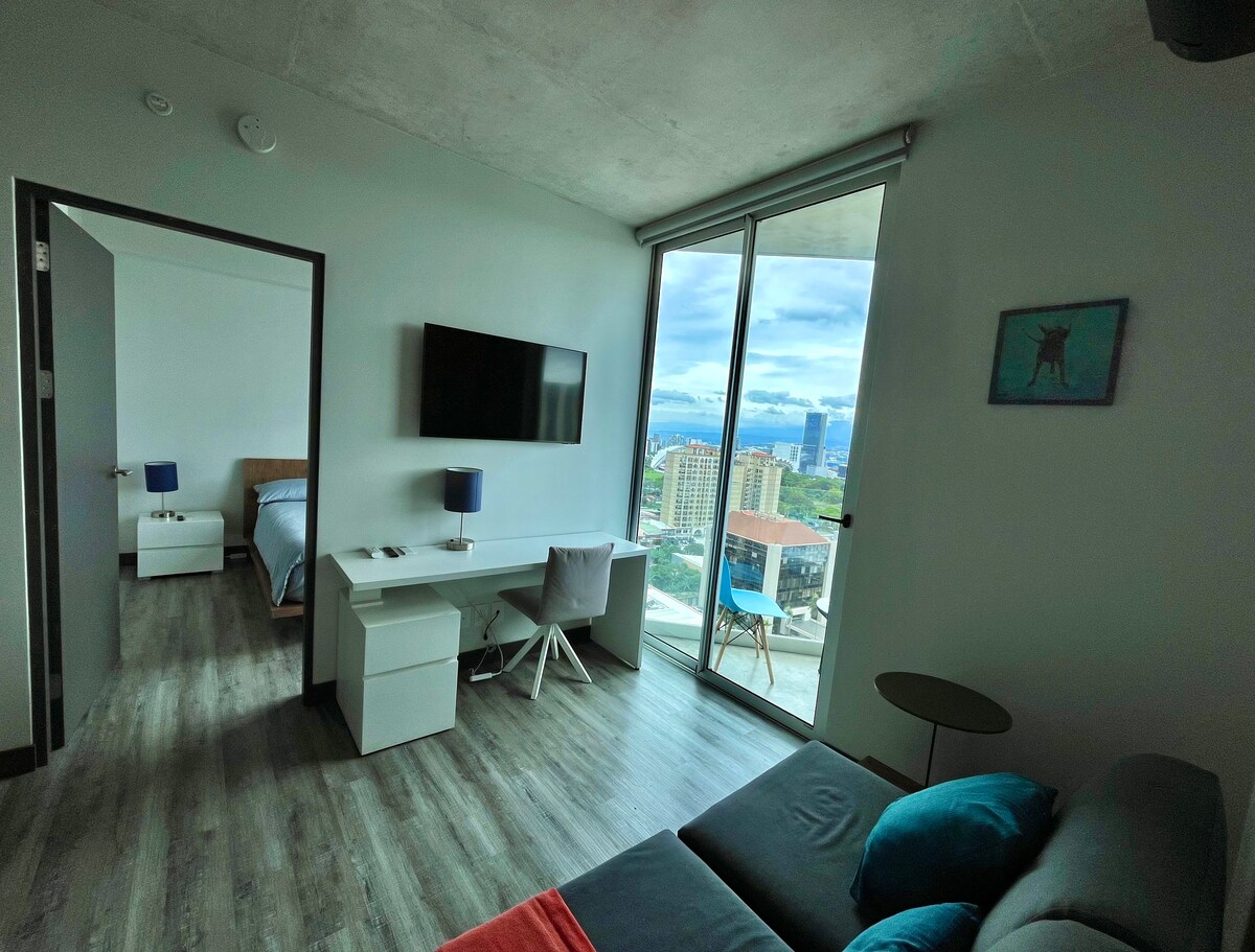 Apartamento de lujo con aire acondicionado, acogedor y perfectamente ubicado en el corazón de la ciudad. Este espacio totalmente equipado, con decoración moderna y elegante, te ofrece la libertad de vivir de forma segura y cómoda mientras exploras todo lo que la ciudad tiene para ofrecer. Cerca de atracciones turísticas, bancos, supermercados y restaurantes. (El condominio cuenta con 8 restaurantes dentro de las instalaciones) El Aeropuerto Internacional (SJO) está a 20 minutos, el Parque La Sabana y el nuevo Estadio Nacional están a 3 minutos en San José.