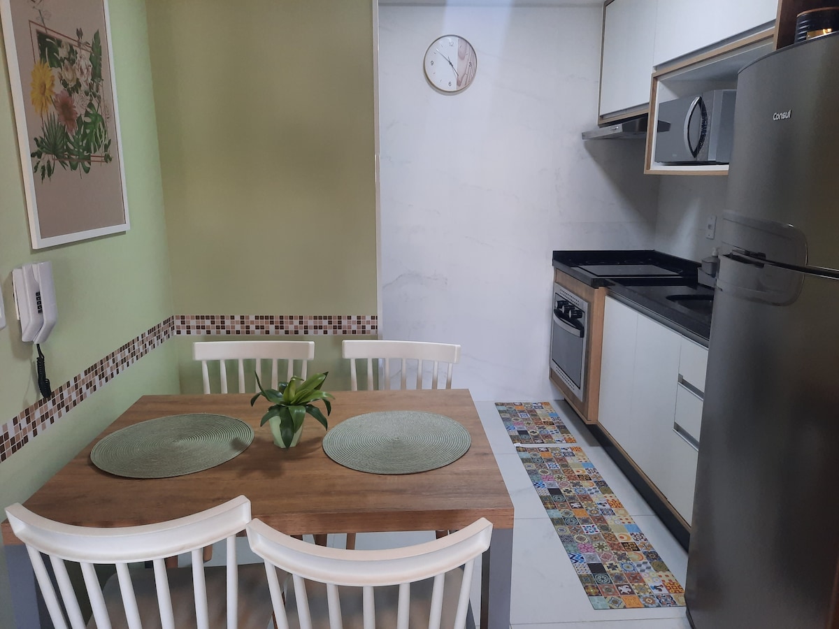 Apartamento nuevo, recién construido a 5 minutos en coche del centro de la ciudad (3 km). El edificio está en una zona residencial y el apartamento tiene 2 dormitorios con balcón, una suite y un baño. La cocina es de estilo americano, que está integrada con la sala de estar que tiene un gran televisor de 50'' con Internet. Nuestro espacio es seguro y sigue los protocolos de higiene de Airbnb. Tiene un espacio de estacionamiento interno, pero con capacidad para dos coches pequeños. El apartamento está en la planta baja (no tiene escaleras).