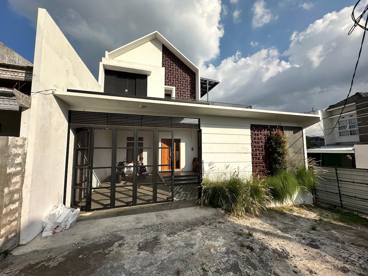 Una casa con diseño industrial en medio de Malang. A 10 minutos de UB, a 5 minutos de Suhat, a 15 minutos de la terminal de Arjosari, a 20 minutos del aeropuerto, a 20 minutos de la estación de Malang, todos los lugares de reunión en Malang a menos de 10 minutos. el estado del entorno es muy tranquilo, el patio trasero es adecuado para la barbacoa/parrilla y la reunión. el paquete de autos tiene capacidad para un máximo de 2 autos. hay wifi, televisión android para Netflix y cocina.