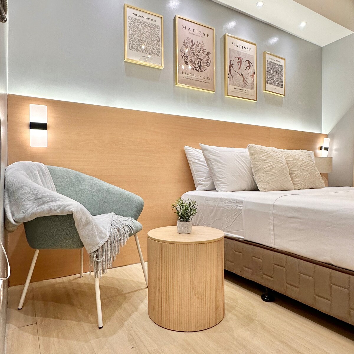 A cozy modern Scandinavian/tropical retreat nestled in the heart of the city. This is a place where you can relax, unwind and have fun with your loved ones or just by yourself. The living area is adorned with light-colored wooden floors, providing a warm and welcoming ambiance. Furnished with simple yet stylish Scandinavian/Tropical furniture. The kitchen is fully functional. Equipped with all your cooking needs. The bedroom’s minimalist design will for sure give you a restful night’s sleep.