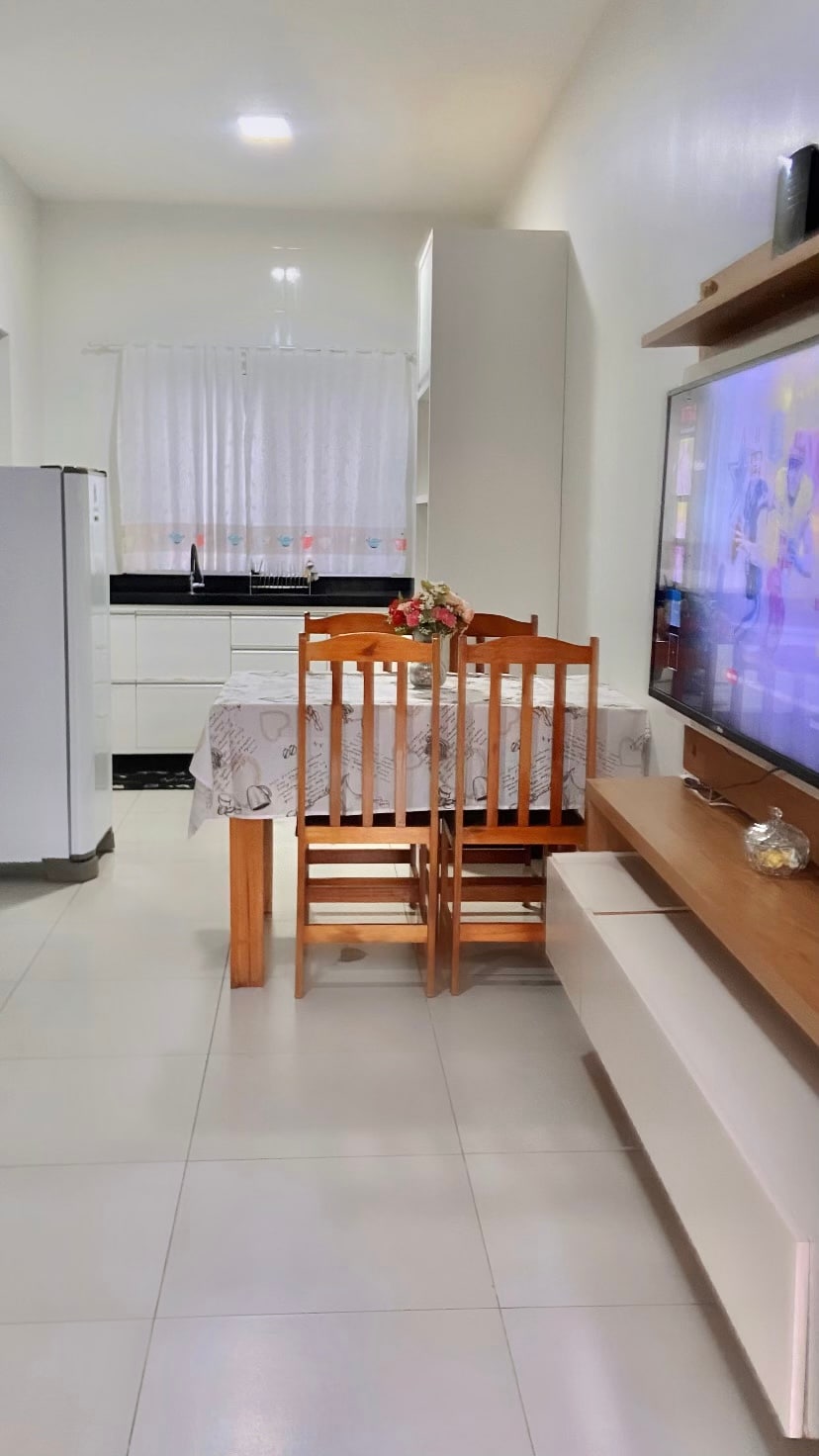 Casa com cozinha sob medida completa, com fogão, forno elétrico, geladeira, mesa e utensílios do dia a dia. Possui um quarto com cama de casal, roupeiro e ar-condicionado. Sala espaçosa com TV e poltronas. Banheiro grande. Garagem para dois carros e espaço externo com gramado e churrasqueira. Localizada em um bairro tranquilo, com belo pôr do sol, de fácil acesso a supermercado, farmácia, Havan e BR.
