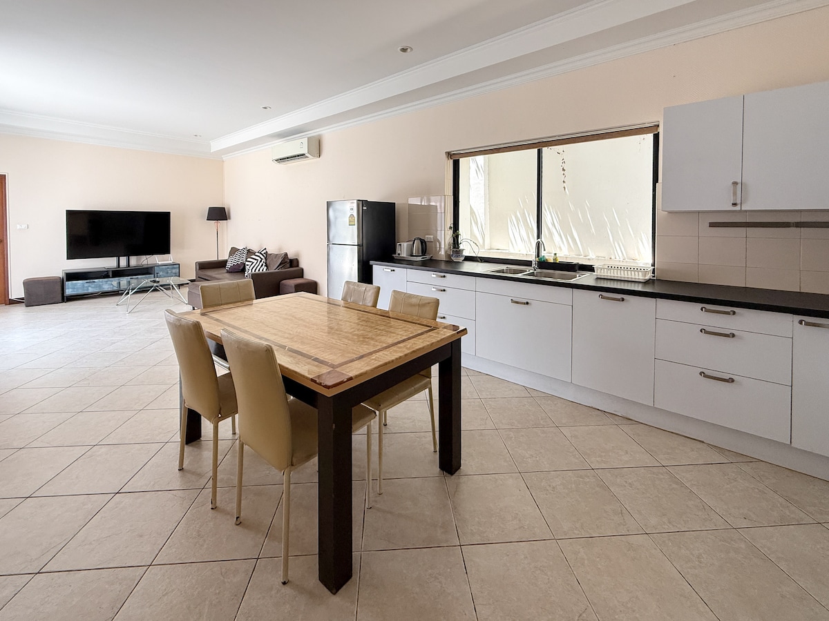 空间介绍 | 舒适入住 +便利生活 + 私享度假 客厅 配备舒适大沙发与超大液晶智能电视,支持在线影视,全屋高速 WiFi 覆盖,无论是休闲放松还是聚会娱乐,都能满足需求。 厨房与餐厅 开放式餐厅设计,可容纳10人以上同时用餐,适合家庭聚餐或朋友聚会。 厨房设备齐全,提供基本餐具、锅具、热水壶、微波炉等,轻松制作简餐或当地美食。 卧室(共4间,均位于一楼) 每间卧室均配备: 加大双人床,保障睡眠舒适 独立卫生间与淋浴间,干湿分离,保护隐私 齐全洗浴用品:洗发水、沐浴露、吹风机等一应俱全 布局合理,适合家庭或多组朋友共同入住,每间卧室均享有同等高品质配置。 室外空间 私人泳池:独立设计,随时享受清凉 BBQ烧烤区:配备烧烤炉,可举办户外烧烤派对 休闲区+草坪:设户外座椅,为指定吸烟区,宜放松小憩或午后闲聊 洗衣间 独立洗衣空间,配备洗衣机,方便旅途中清洗衣物,适合中长期入住。 温馨提示 所有卧室位于一楼,免去上下楼烦恼,特别适合长辈或儿童。 室外休闲区设有吸烟区,室内全区域请勿吸烟携全家人入住这处美妙房源,享受充裕空间和精彩活动。