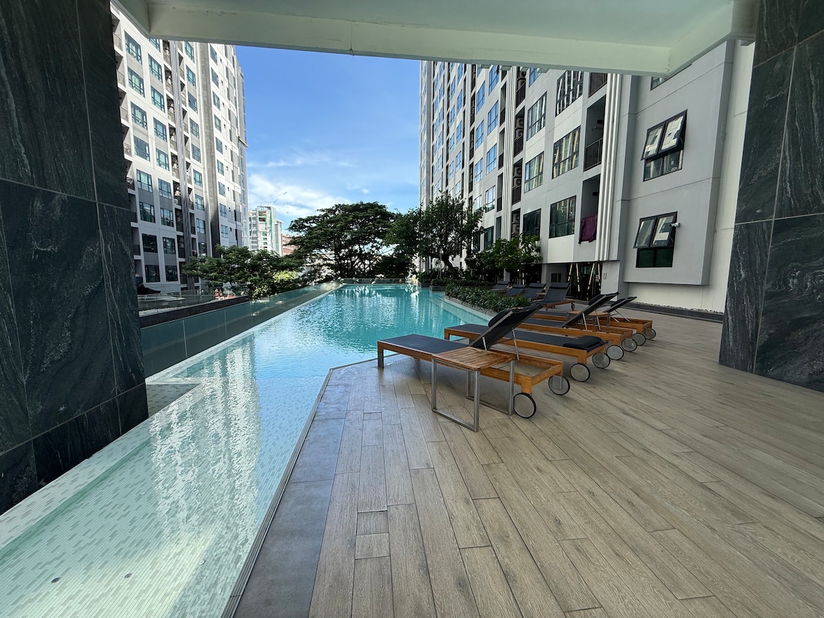 NEWEST! AND BEST CONDO IN PATTAYA! SPECTACULAR! ONE OF A KIND OVER-HANGED ROOF TOP SWIMMING POOL SEA VIEWS ON HIGH FLOOR, 1 BEDROOM, 1 BATHROOM, 1 KITCHEN IN-ROOM WIFI ROUTER. NO SHARING WITH OTHER APARTMENTS -TO SLEEP 3 PERSONS, PLEASE READ "THE SPACE" -2 swimming pools, best condo gym in Pattaya -300m walks to Pattaya beach -3 mins walk to famous shopping centers, Central Festival, The Avenue -5 mins walk to Soi Bua Khao -10 mins walk to Walking Street