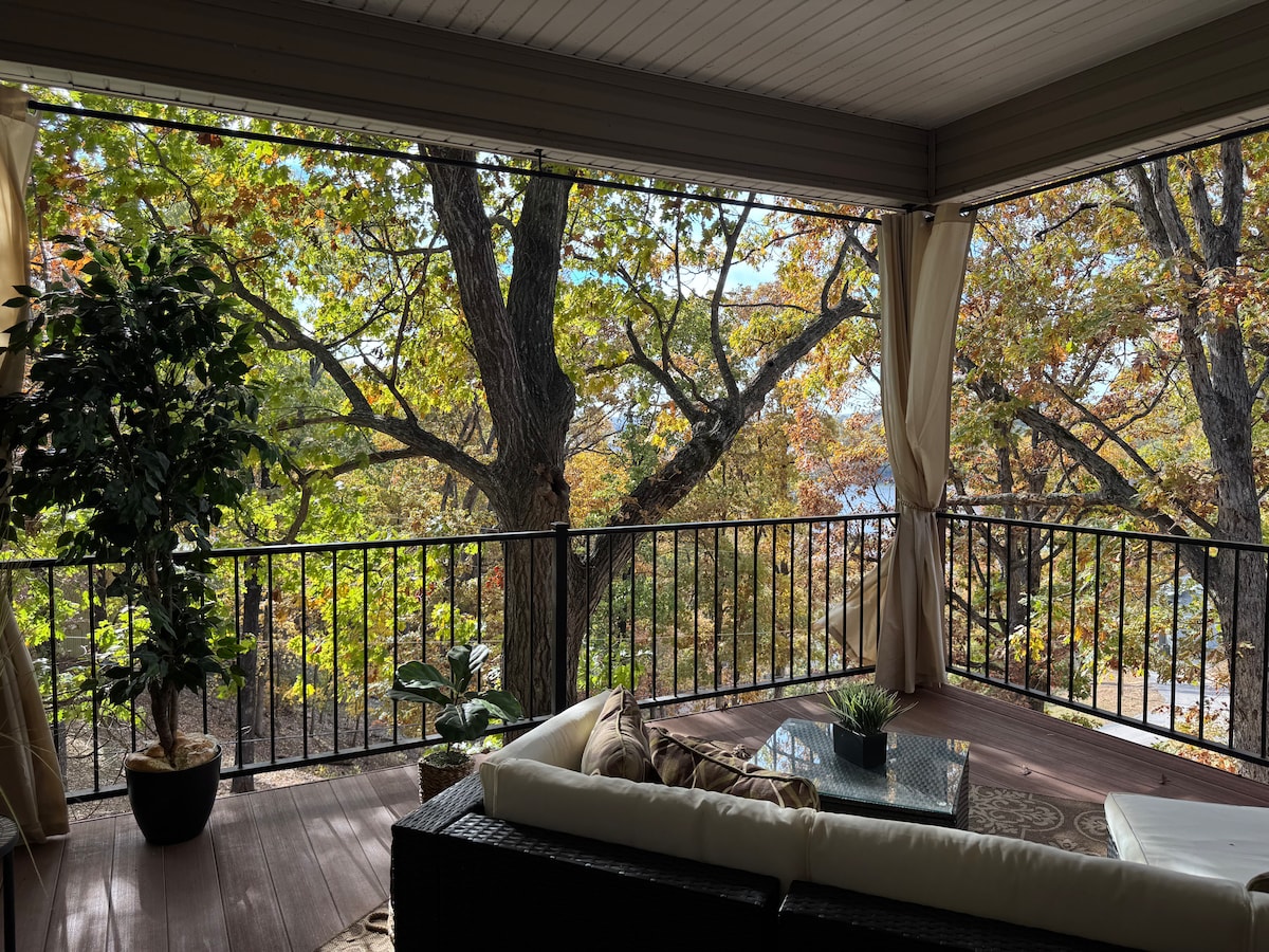 Entire lake house ready for your next lake retreat with family or friends. Spacious living area including outdoor deck space with a private dock and kayaks for use! Watch the sunset on the dock while grilling out or next to the gas fire pit. Cozy up next to the wood burning fireplace. **NEW LOWE Tritoon BOAT RENTAL option or space to side dock your boat. Close to the strip, grocery stores, and restaurants. Mini golf, go-karts, and a winery are also nearby. Perfect for a weekend or long get away.