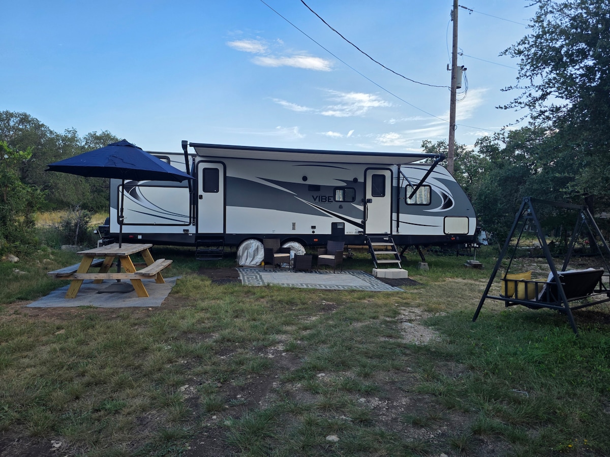 ¡Da la bienvenida a nuestra relajante y feliz autocaravana! Este espacio tranquilo es la escapada perfecta para parejas o solteros. Ubicada en nuestra propiedad privada de 4 acres, tienes todos los servicios básicos para una estancia cómoda, incluida una zona de barbacoa compartida y una casa del árbol. Estamos justo en el corazón de Texas Hill Country, a solo 5 minutos del anfiteatro Whitewater, Tubing on the Horseshoe y a 25 minutos del famoso parque acuático Schlitterbahn en New Braunfels.