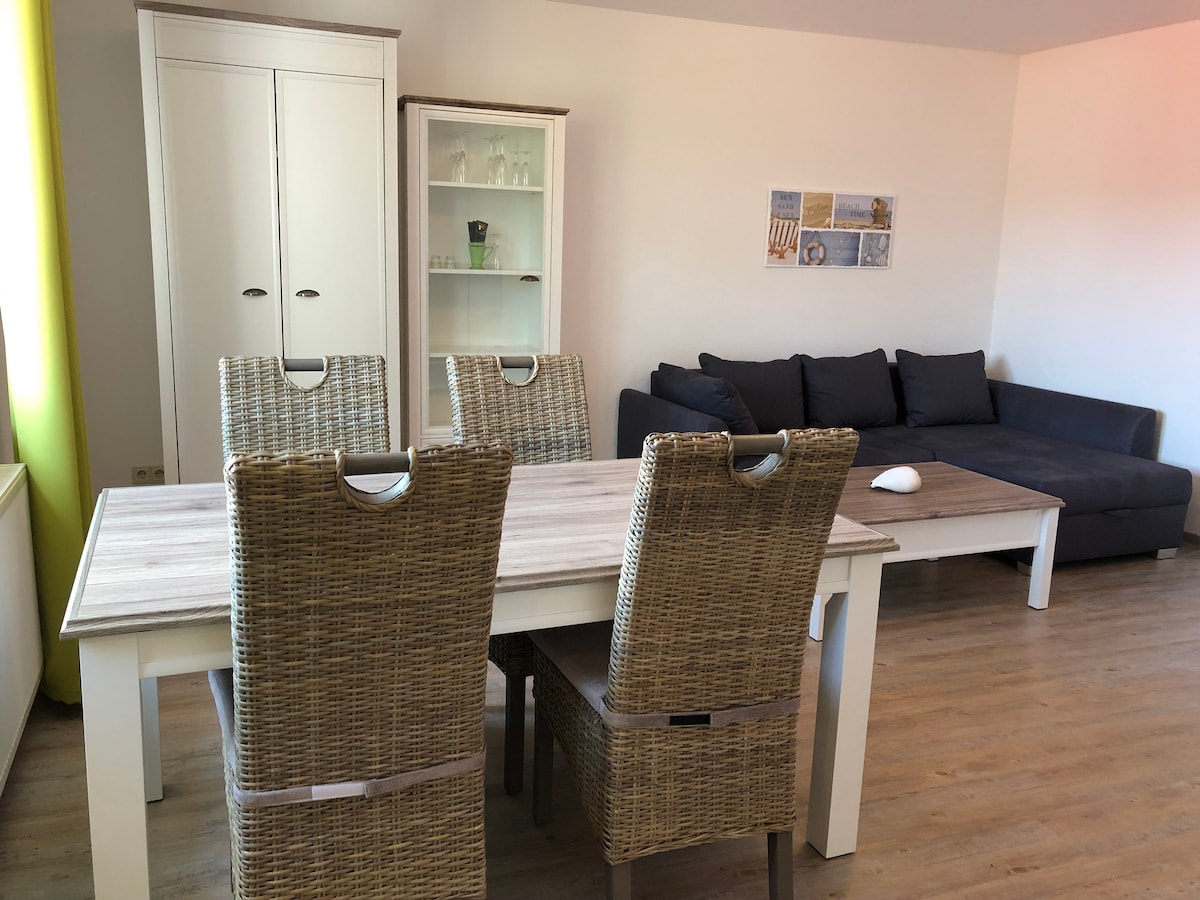 Apartamento Adebar en la casa Seeadler con espacio para 2 personas (26 metros cuadrados). Salón/dormitorio con muebles de madera brillante, pantalla plana, 2 sillas lounge; wifi gratuito; cama matrimonial tamaño king (180 x 200 cm); armario grande; cocina (vitrocerámica de dos quemadores, nevera con congelador); acogedor comedor en la sala de estar; Baño nuevo con ducha; Estacionamiento incl.