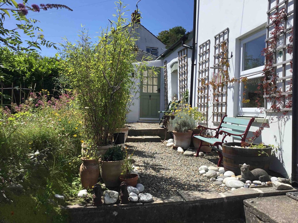 Conveniently placed for walking the coastal paths, set in an acre of lawned garden, the cottage has a comfortable double bedroom with optional blackout blind, sitting room with well equipped kitchenettte, & multi fuel stove. Freesat TV, wifi & central heating included. Separate utility with sink, freezer, dishwasher & washing machine. Welcome pack includes milk, filtered water, tea & instant coffee. Private shower room with toilet & hand-basin. Private patio area & BBQ. Shared use of garden.