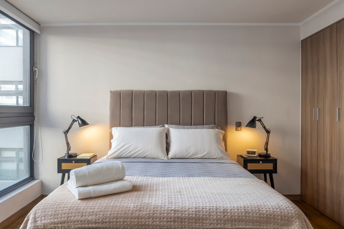 Comodidad y estilo con gran ubicación. Departamento nuevo, decorado con excelente gusto y detalles que invitan a sentirse bien. Cuenta con terraza y vista a la cordillera, estacionamiento, dos habitaciones, escritorio, A/C, WiFi rápido, Smart TV y cocina full equipada, gym.Ubicado en Ñuñoa, zona tranquila y segura, a pasos del metro y Mall Plaza Egaña, rodeado de gastronomía, tiendas, clínicas y servicios. Ideal para viajeros exigentes que buscan descansar, trabajar cómodos o explorar Santiago!