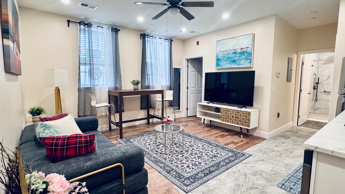 ¡Presentamos nuestra nueva suite privada de 1 dormitorio y 1 baño, impecablemente limpia y deliciosamente moderna! Diseñado con el estilo y la comodidad en mente, este acogedor espacio promete una estancia inolvidable. Tu exclusivo refugio cuenta con una cocina totalmente equipada, un baño de lujo y un espacioso televisor inteligente de 55 pulgadas para todas tus necesidades de streaming. Disfruta de conexión WiFi de alta velocidad de cortesía, climatización con aire acondicionado y calefacción, y acceso a nuestras instalaciones compartidas de lavandería para huéspedes, todo diseñado para mejorar tu experiencia.