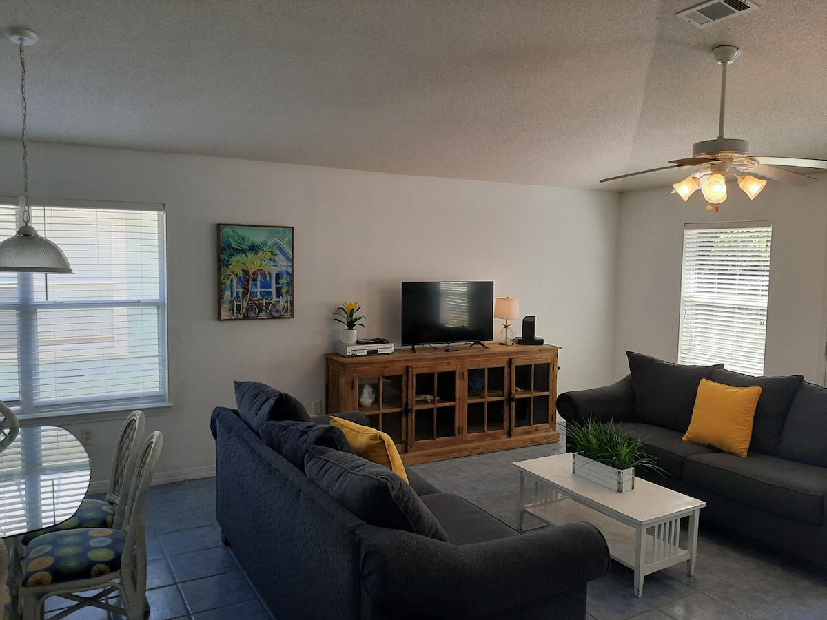 **Casa de lujo de 305 m² en 0,46 acres **Piscina de agua salada/spa climatizada o refrigerada ** Sala de juegos ** Lanai con proyector de películas **Fogata y altavoces al aire libre **Cama Master-King y baño privado **Segundo dormitorio con cama tamaño king **A 7 km de la playa ** Piscina y patio vallados para la seguridad de los niños **Mesa de comedor para 12 personas con rincón de desayuno **Calefacción/aire acondicionado central, lavadora/secadora **Internet y equipo de playa gratis ** Mesa de comedor en el patio con barbacoa Weber **Oficina con escritorio e impresora