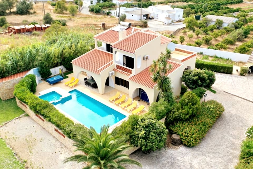 Nuestra hermosa villa de 4 dormitorios con aire acondicionado, jardines, piscina y barbacoa está situada en Vale de Para, a solo 1,8 km de las playas de Galé, con bandera azul, con un olivar a un lado y viñedos al otro, pero cerca hay numerosos restaurantes, tiendas y supermercados a poca distancia a pie. El casco antiguo de Albufeira está a solo 10 minutos en coche. También está cerca el centro comercial Algarve (hipermercado y cine) a solo 6 km, y el campo de golf de Salgados. Servicio de limpieza y calefacción de la piscina disponibles.