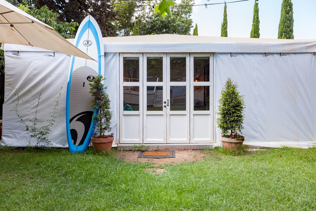 Nuestro alojamiento está situado en nuestro jardín de 250 metros cuadrados con un lugar para sentarse al aire libre. El espacio es de 9*3 metros, 27 metros cuadrados, situado en una tranquila vecindad con un fácil acceso para ir a todas partes. Hay una pizza, un supermercado y una tienda de groserías cerca. Un amplio parque está a un minuto a pie para correr y relajarse. El centro de la ciudad de Herzliya está a 5 minutos a pie. El lugar está decorado como una cabaña de surfistas, las medidas de la cama son 140/190 cm.