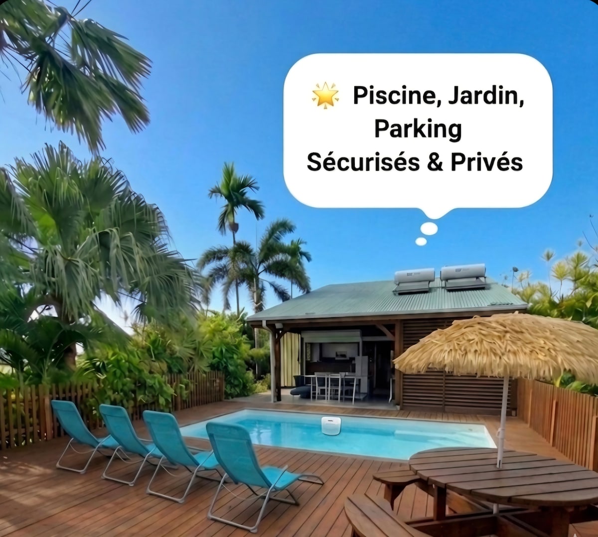 Magnífico entorno muy relajante. ¡Invitación a la desconexión! Muy bonito bungalow con piscina privada, vistas al mar. 40 m2 con ducha a ras de suelo, hermosa habitación, terraza cubierta con cocina americana + una terraza de 50 m2 equipada con tumbonas. Barbacoa disponible. Hermosas caminatas para hacer en la hermosa campiña de los alrededores (ríos, cascadas, parque floral) o en la zona. El bungalow está a 15 minutos del mar, a 15 minutos del aeropuerto y a 10 minutos de los centros comerciales.
