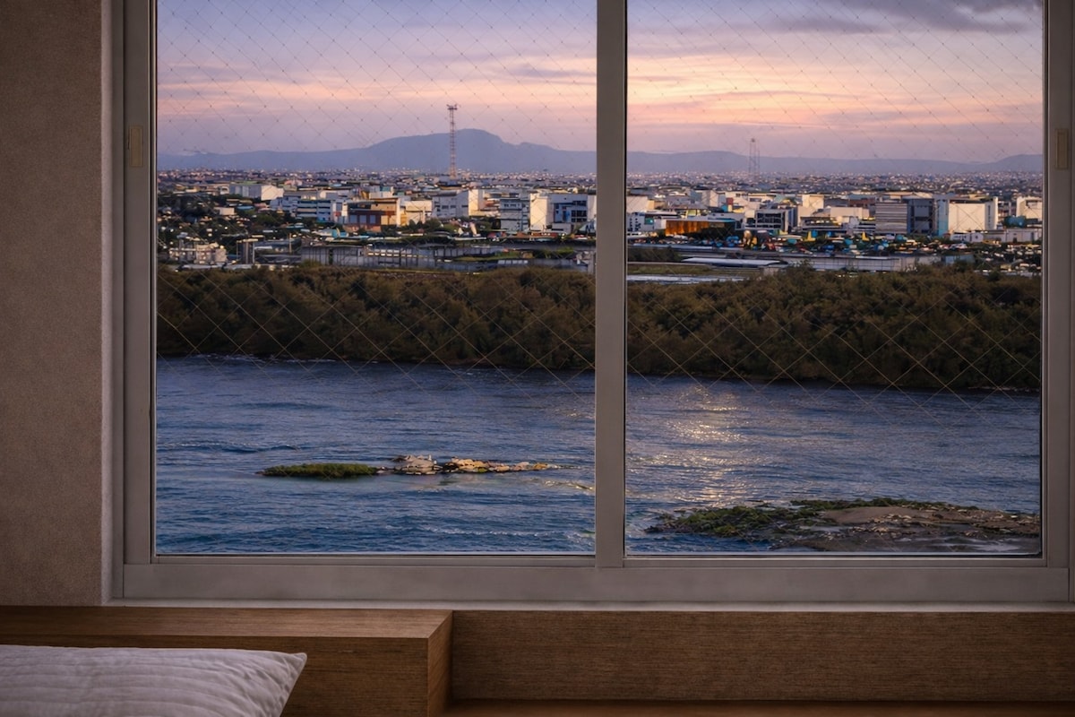 Desperte todos os dias com a vista deslumbrante do Rio São Francisco da suíte e do segundo quarto. Relaxe na sala climatizada integrada à cozinha completa ou desfrute momentos de lazer. Wi‑Fi, ar‑condicionado e garagem garantem conforto total. Localização premium: a poucos passos da ponte Petrolina–Juazeiro, da orla, do centro e restaurantes, com shopping e centros médicos a poucos minutos de carro. Experiência exclusiva na orla, reserve já! Ideal para profissionais e famílias.