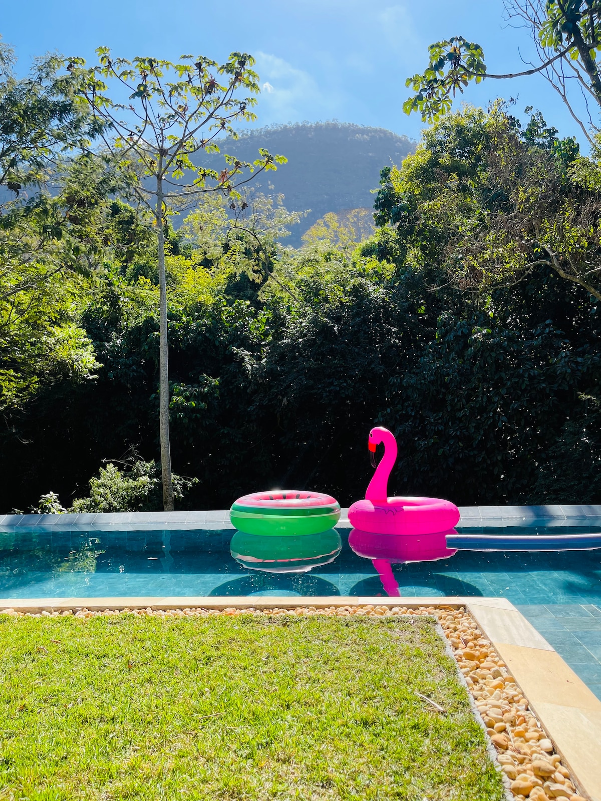 Linda casa em estilo Provençal com deck e piscina privativos debruçados para o riacho. Duas lindas suites com camas queen e casal , varanda, ar split e vista para o lago . Mezanino ao lado da suite principal com bicama de solteiro. cozinha completa , sala ampla, churrasqueira portátil! Ideal para famílias ou momentos românticos na Serra de Petrópolis. Seu pet é muito bem vindo! Não permitimos eventos no local!