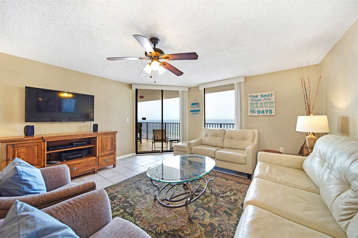 ¡Piscinas cubiertas y descubiertas! ¡Frente al golfo! - 1700 pies cuadrados, camas para 10 huéspedes. En el piso 14 con una vista adictiva del Golfo de México verde esmeralda, balcón, 2 dormitorios con camas tamaño king y baños privados, 2 sofás cama tamaño queen y 2 camas plegables individuales. La Cocina esta totalmente equipada Mesa/barra para comer. Lavadora/secadora en la unidad. Gimnasio, jacuzzi, chapoteadero para niños. Fogata. Ofrecemos kits de inicio para productos de papel y detergentes. Wifi incluido.