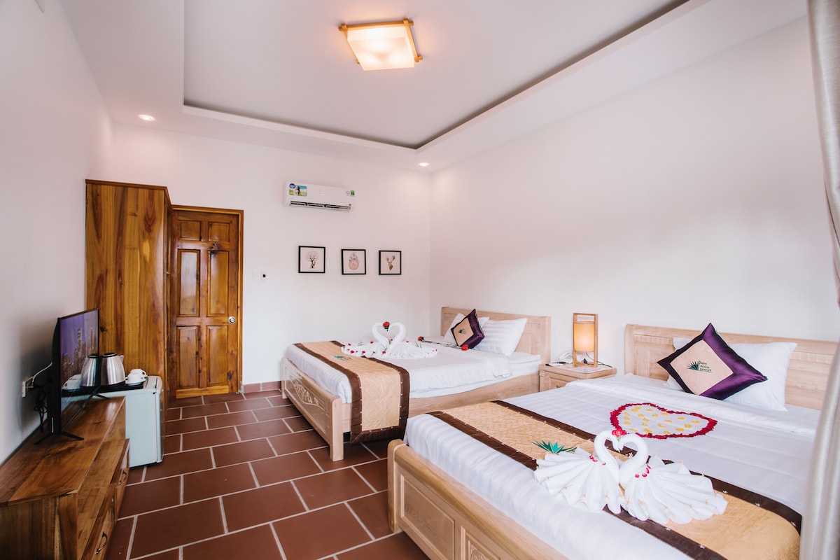 Habitación triple con baño compartido Esta habitación está equipada con tres camas individuales y aire acondicionado, que ofrece toallas, taquillas personales, perchas para ropa y agua embotellada. Los huéspedes pueden acceder a baños compartidos separados por género con duchas de agua caliente. Se proporciona un servicio de limpieza diario para garantizar una estancia limpia y cómoda. Es el lugar perfecto para grupos pequeños que buscan explorar Phu Quoc juntos.