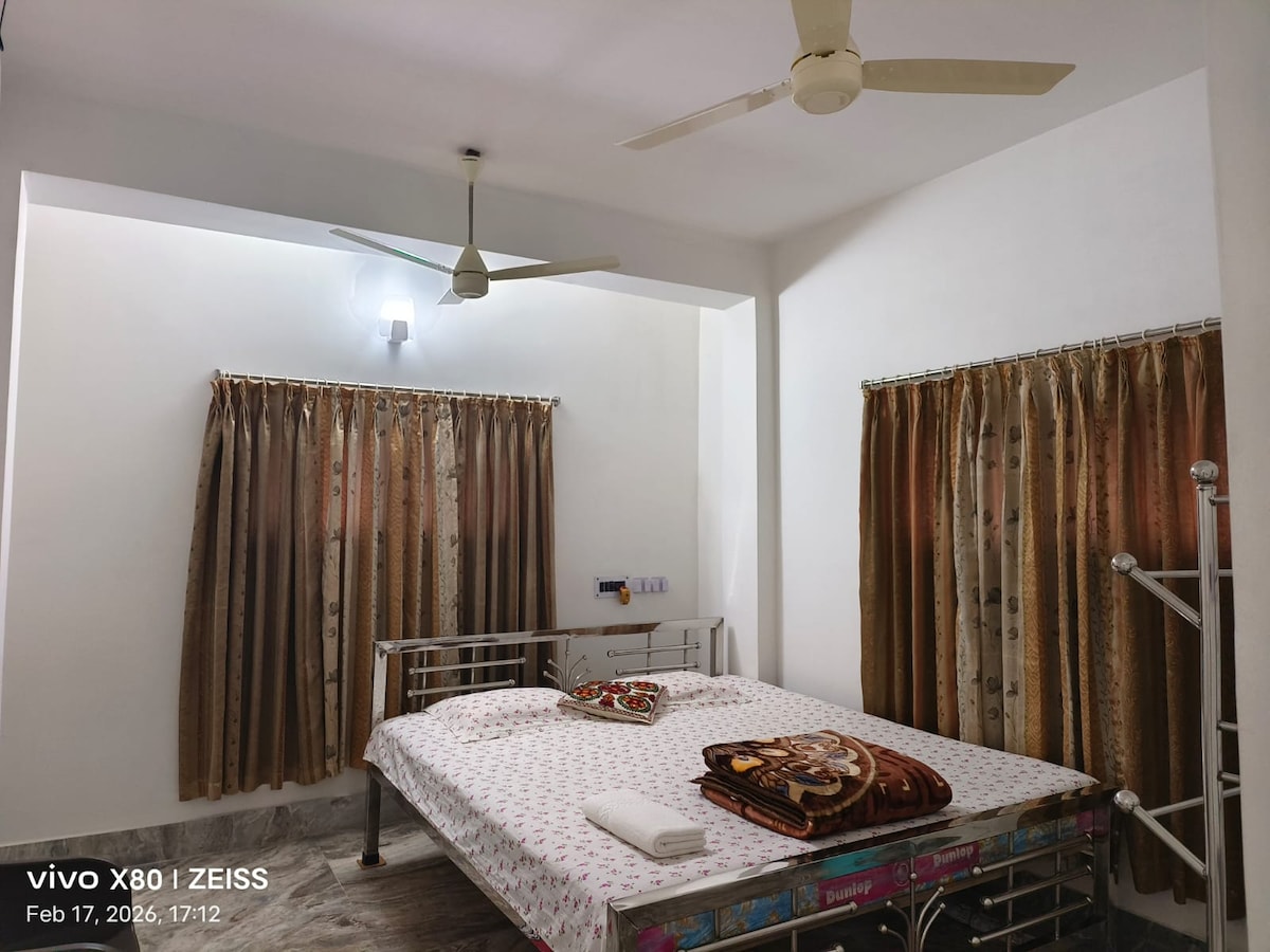 Namaste! Your Fully Air-Conditioned Mayapur Home Experience the Holy Dham in absolute comfort! Our premium 2-bedroom apartment is perfect for families seeking modern conveniences near ISKCON (900m). Rare in Mayapur, this flat features AC in every bedroom and a washing machine—ideal for longer stays. Located on the raised ground floor, it offers easy access relax, recharge, and focus entirely on your spiritual journey.
