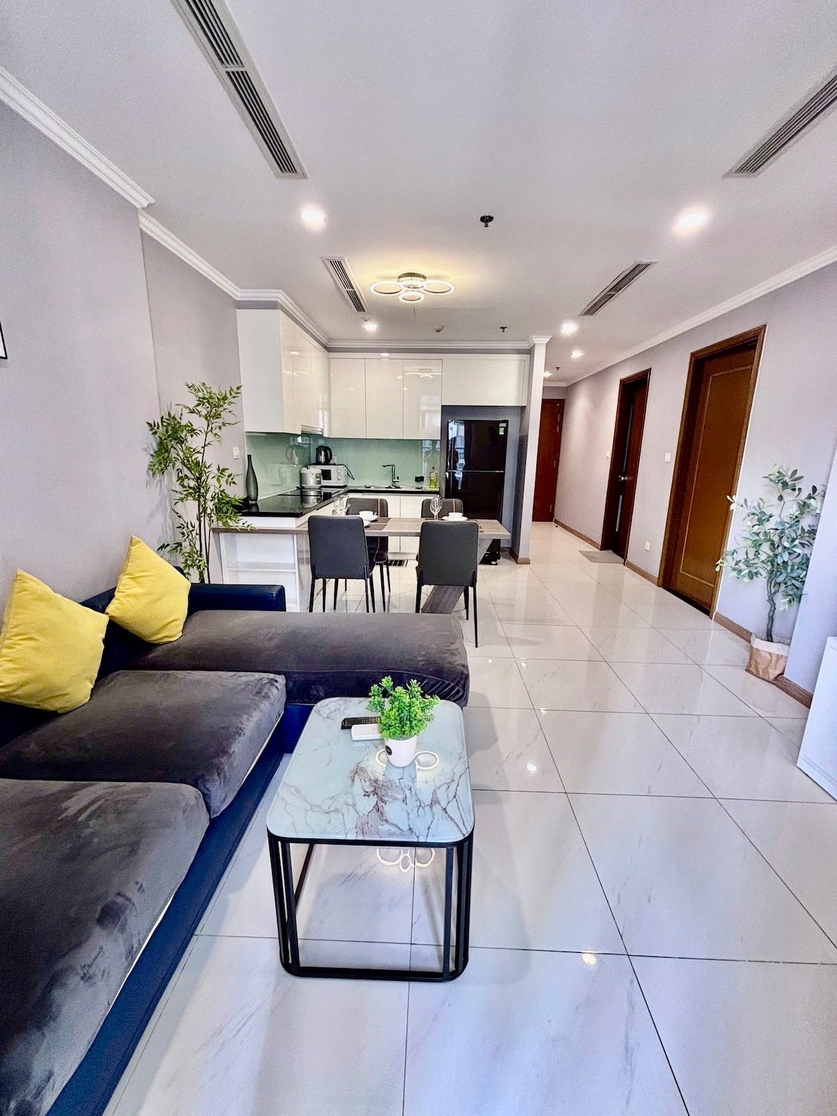 Luxury 5* The Opera Residence by ChiHome - River View CBD District 1, SkyVilla Corner Apartment - Tower A Level 2x.03A, 70m2, 2 habitaciones. La Ópera Metropole Thu Thiem - Torre A, Massimo, nivel 2x unidad 03A - Tamaño: 70 m2 (unidad de esquina) - Incluye 2 dormitorios, 2WC, cómodos para alojarse de 2 a 4 personas. - Televisión inteligente de 65 pulgadas con Netflix y YouTube - Sofá, sillón, mesa de té. - Mesa de comedor con 4 sillas. - Utensilios de cocina completos. - Internet inalámbrico de alta velocidad disponible. • Aire acondicionado para toda la casa - Acceso 24/7 al edificio, los 7 días de la semana.
