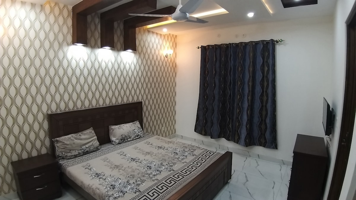 La casa está situada en el centro de Lahore. Tiene tres dormitorios con armarios y baños, un gran salón y una gran cocina, TV y un lugar adecuado para planchar. Tiene una entrada automática de tecla + para que puedas elegir cualquiera de las dos. También obtienes un guardia de seguridad/ayudante gratuito las 24 horas del día, los 7 días de la semana. Los aires acondicionados de los tres dormitorios están incluidos en el precio. Defensa (DHA)/Packages Mall: 10-15 minutos Wapda Town/Emporium: 5-7 minutos Gulberg: 5-10 minutos Aeropuerto: a 20 minutos como máximo. Terminal de autobuses Daewoo: 10-15 minutos Ciudad modelo: 5-10 minutos