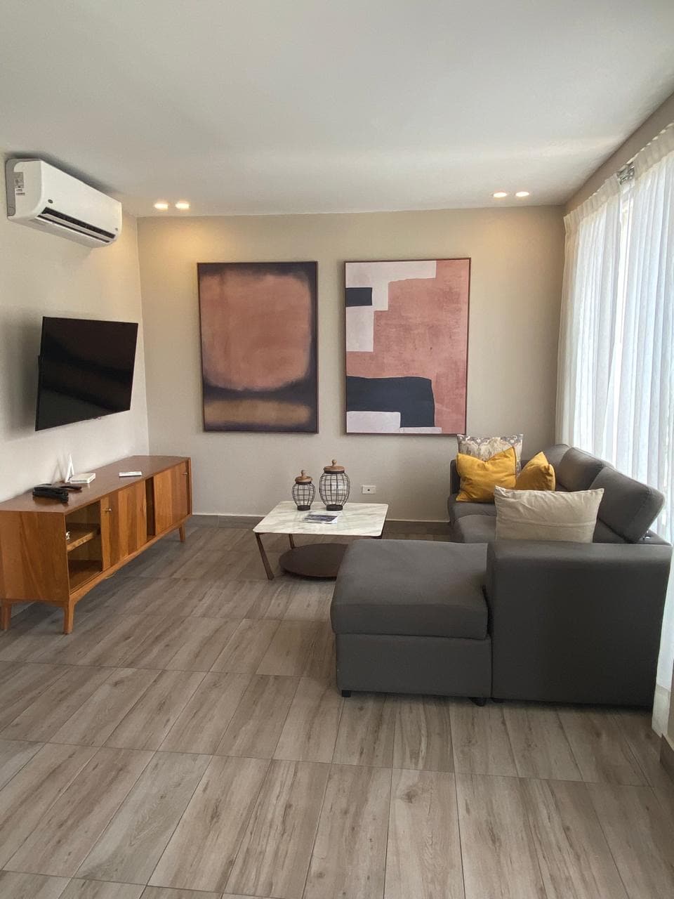 Es un apartamento moderno, comodo y bien equipado a las necesidades que vas a tener en unas vacaciones. Esta ubicado en 1 de las mejores areas de pais; donde encontras restaurante gourmet, comida rapida, al frente una plaza, 3 minutos de Agora Mall, con cine y diversos restaurantes, la torre tiene una impresionate area social del cual puedes ver toda la ciudad, en el roof top esta la pisina y el Gym, tiene 6 elevadores y un lobby espectacular. 1 parqueo, WIFI, AC y fancoil, seguridad 24/7.