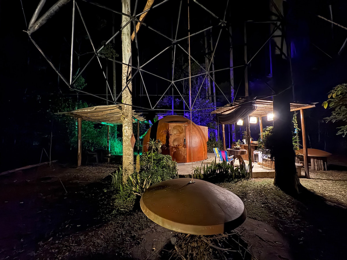 A Suíte Adobe foi construída ao redor de uma pedra natural e paredes de terra ensacada compactada. Oferece conforto inigualável, com cama construída em uma plataforma de vidro sobre a pedra. Há uma banheira de hidromassagem com vista panorâmica para a natureza da propriedade. Possui uma cozinha equipada com muitos utensílios e eletrodomésticos. Na sala, uma charmosa lareira ecológica fixada na pedra. Área externa temos lareira de jardim, com cadeiras de madeira e luzes apreciar a natureza.