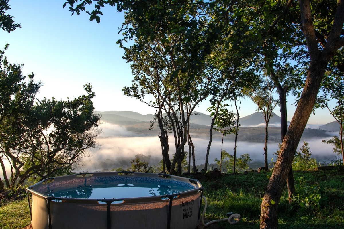 La cabaña para 2 está construida con piedra natural y se equilibra en un acantilado de 80 m de altura con vistas a un valle cubierto de árboles y una montaña a lo lejos. La cabaña cuenta con lujos como aire acondicionado, chimenea tanto en el interior como en el exterior, piscina de roca y jacuzzi en el borde del acantilado, ducha al aire libre y un baño con vistas al valle. Aloe Rock Cabin está bien equipada con electricidad de 220 V, calentador de agua, estufa, microondas, barbacoa de gas, nevera, congelador y todas las cosas necesarias para el día a día.