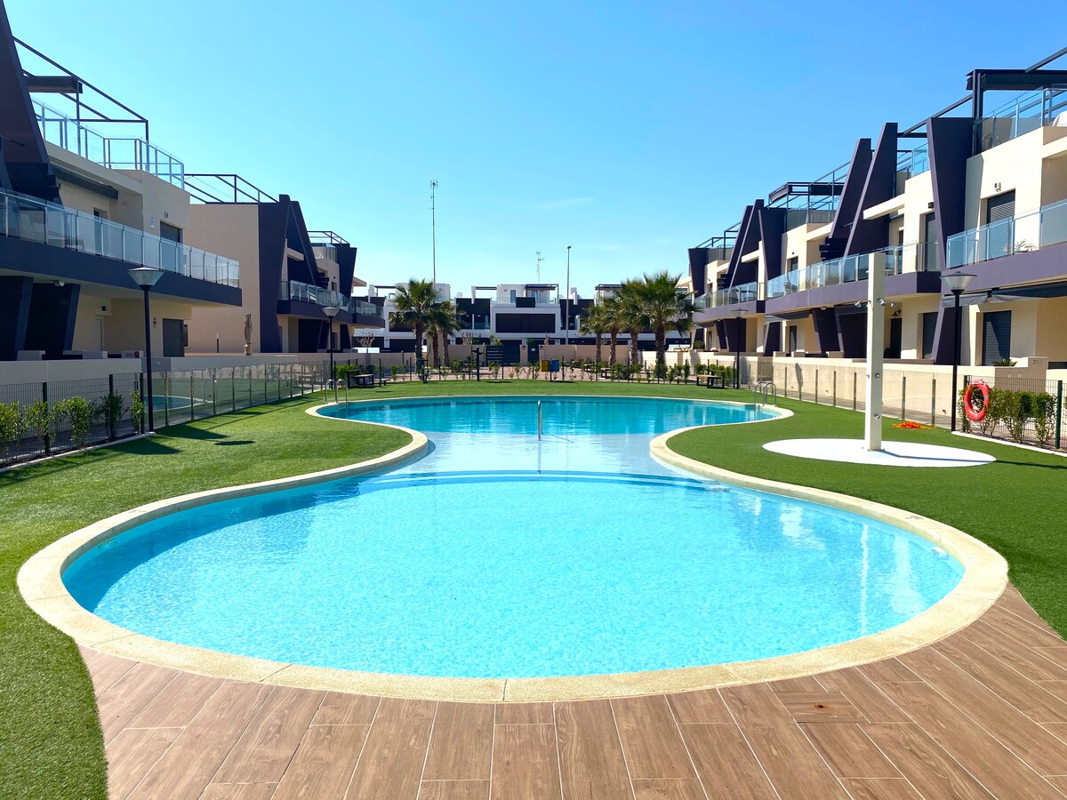 Precioso y moderno bungalow de planta baja de 2 dormitorios esta ubicada en la famosa zona de Playas Higuericas que destaca por su magnifica playa, restaurantes para diferentes gustos y largo paseo al lado del mar, que se puede recorrer andando o en bici, disfrutando de las vistas y de las brisa marina También podrán disfrutarse de enorme zona común con 2 piscinas, gimnasio exterior, zona infantil etc....