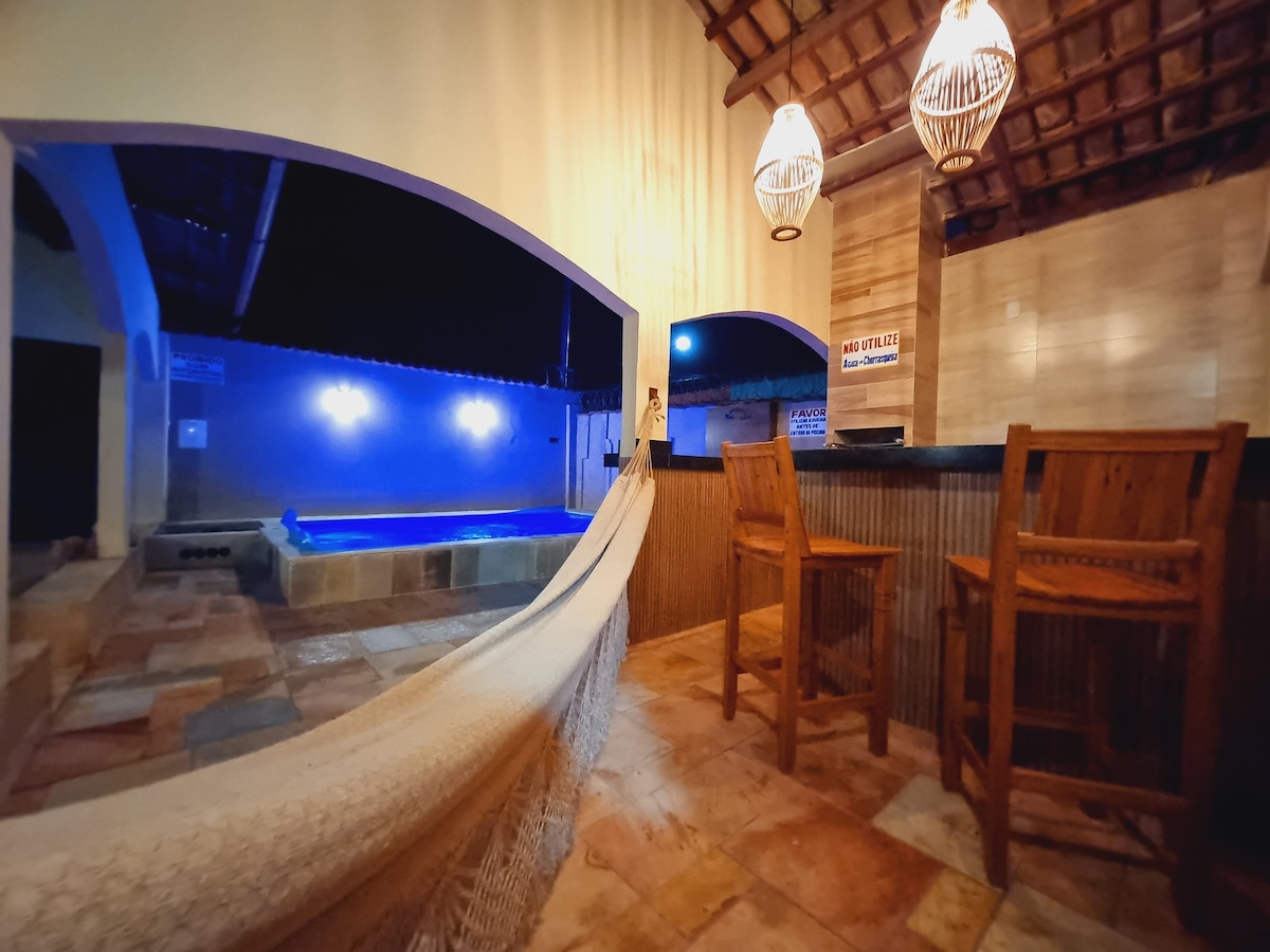Casa nueva, bien ubicada y bien equipada - Aire ACONDICIONADO en los cuatro dormitorios. - Capacidad para 15 personas, incluidos niños -4 dormitorios, 4 camas dobles y 1 Queen, dos de los cuales son suites -3 colchones individuales -1 litera en el dormitorio de la planta baja -1 aseo social en la planta baja, 1 aseo en la zona de ocio -Sala TV - Cocina equipada, horno eléctrico y filtro, fogones, nevera, licuadora, microondas, etc. - Zona de ocio, PISCINA CLIMATIZADA 24 HORAS con iluminación, barbacoa de alta gama con parrilla. -Garagem - WiFi.