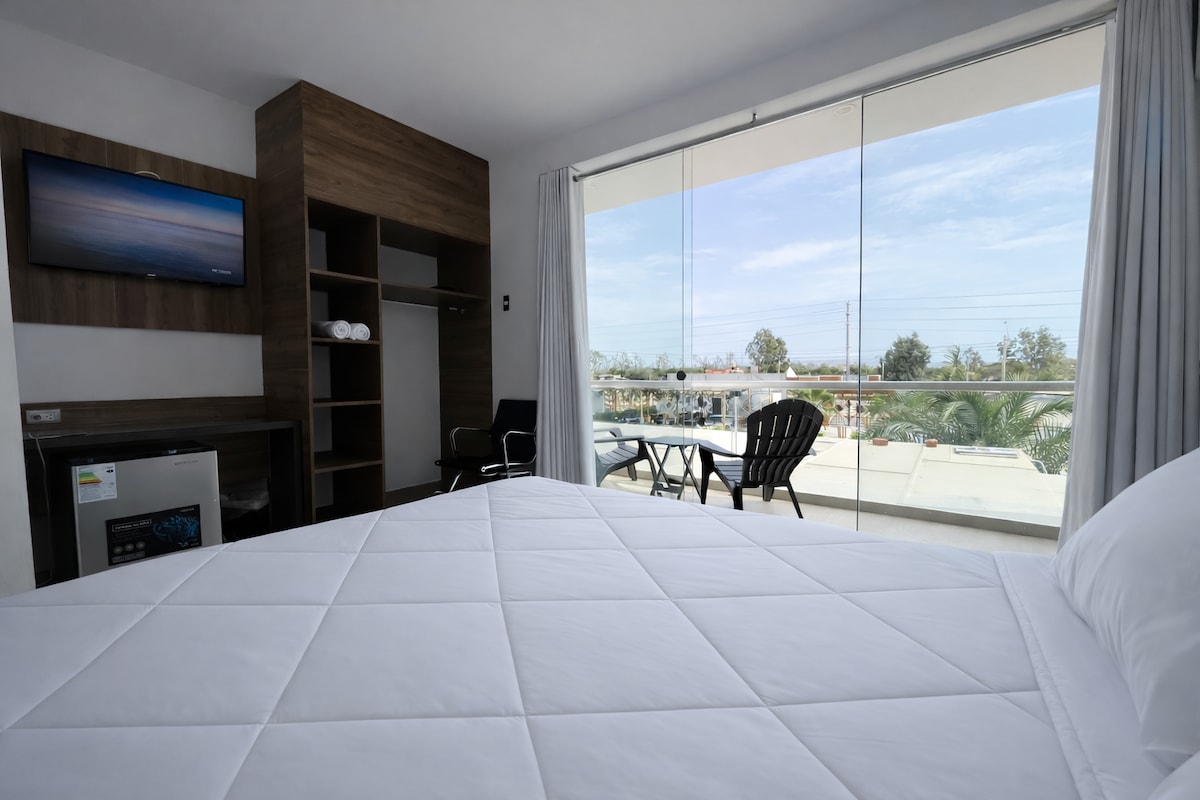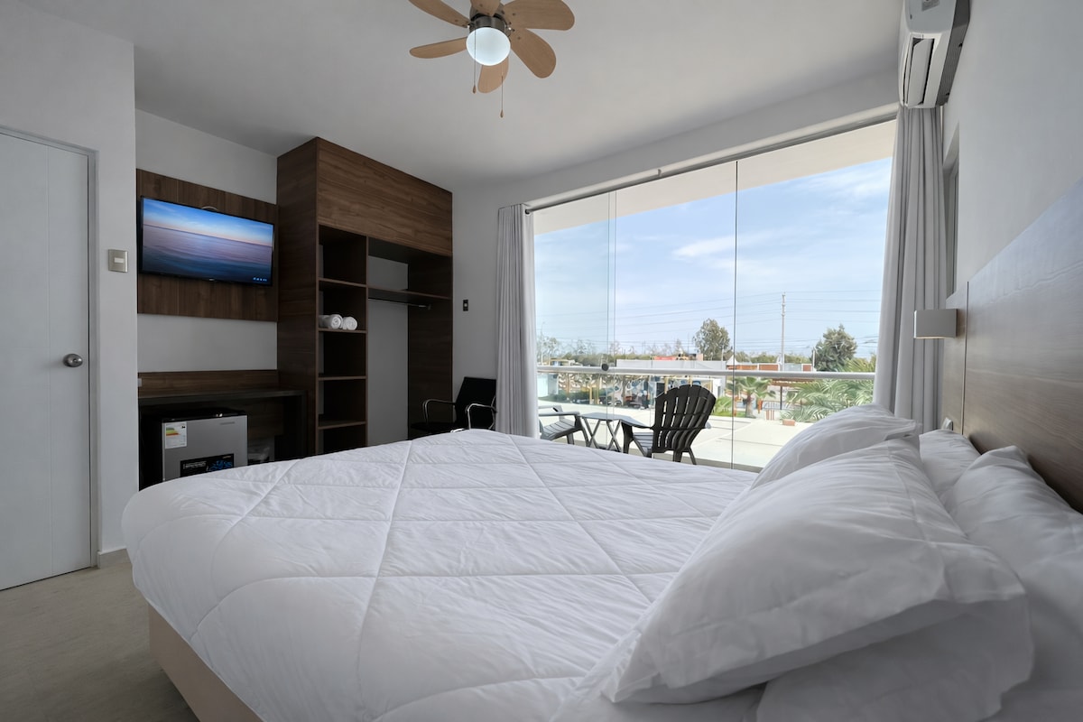 Tu refugio privado para observar pelícanos, lobos marinos y atardeceres en frente a la bahía a solo 25m de la orilla del mar. Pro Tip: si te despiertas temprano y tienes suerte, a veces aparecen delfines y flamencos! Ubicada en una playa privada tranquila y segura a solo 5 minutos de los restaurantes y tours de Paracas. Ideal para: Parejas: Atardeceres románticos sin turistas alrededor. Familias: Espacio seguro y naturaleza pura para los niños.